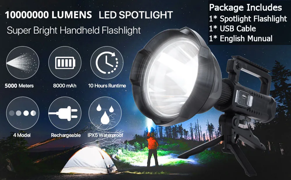 * Large sizes and super bright: large size, high-power spotlights, there is an adjustable bracket at the bottom of the spotlight to support light, liberate your hands. The Super Bright 4 Core LED chip provides the brightest light. The long lighting range is 5000 meters to make it long-distance lighting.