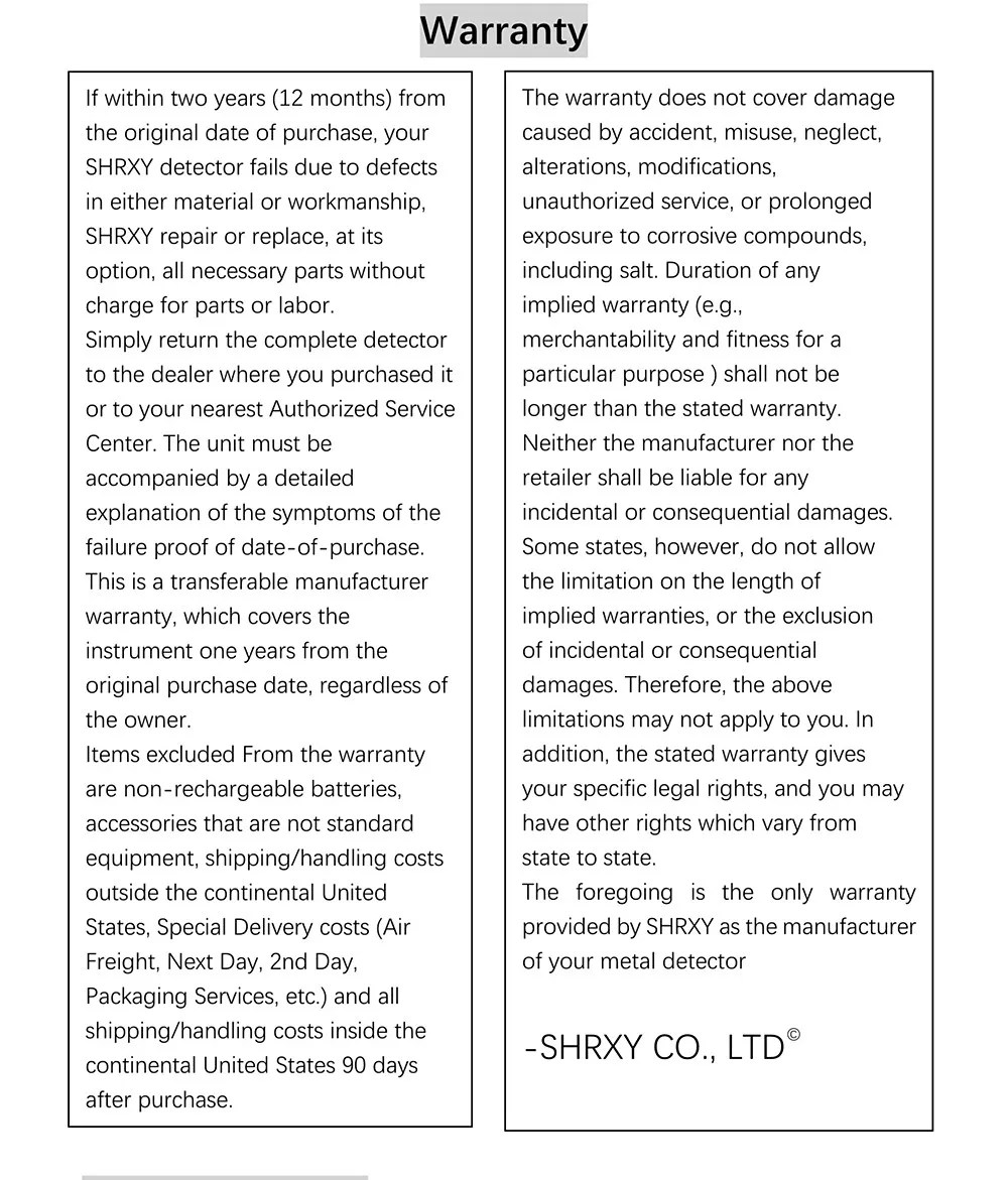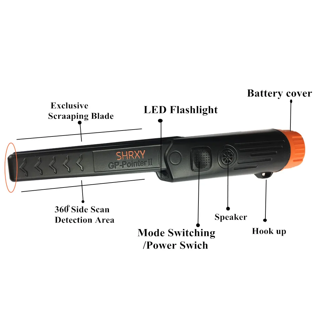The SHRXY is a hand-held metal detector designed to precisely,pinpoint metallic (ferrous and nonferrous) objects,during treasure recovery.The SHRXY is intended for use in conjunction with a ground search metal detector to aid in the recovery of metallic targets. The SHRXY has both audible and vibrating alarms to indicate the presence of metal objects. The alarms increase in intensity as the GP-POINTERII is moved closer to the metal target. With a pinpointing tip plus a scraping blade with side-scan capability, the SHRXY is very effective in easily detecting even the smallest of metallic objects. An LED flashlight assists in dark and low light conditions. The SHRXY has an IP 66 standard waterproof rating .fully protecting it from the environment and allowing it to be washed under running water or operated under the water 2m. The SHRXY POINTER fs durabilitybased on MIL STD 810 F-will provide years of reliable operation even in rugged environments.