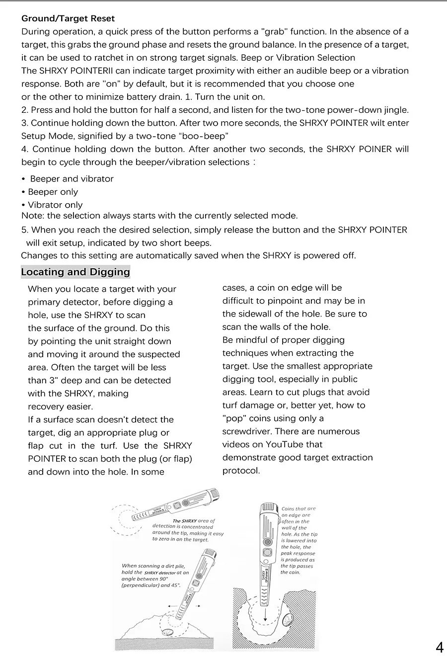 Upgraded version SHRXY GP-POINTERII is unlike any other pinpointer on the market. Using the circuit inside the SHRXY housing. The SRHXY has excellent proportional response, selectable beeper and/or vibrator, More robust LED light, lanyard loops, longer time battery operation, and a weatherproof housing with depth markings make the SHRXY POINTER the most complete pointer on the market.