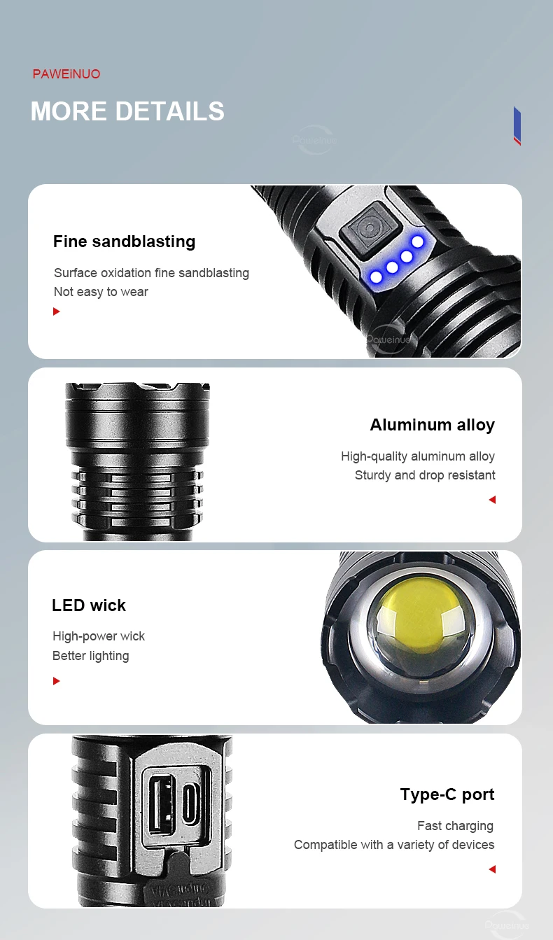 2. 5 levels: strong light-medium light-low light-flash-SOS to meet the needs of different scenes. There are four blue LED power indicators in the battery compartment, making night travel safer.