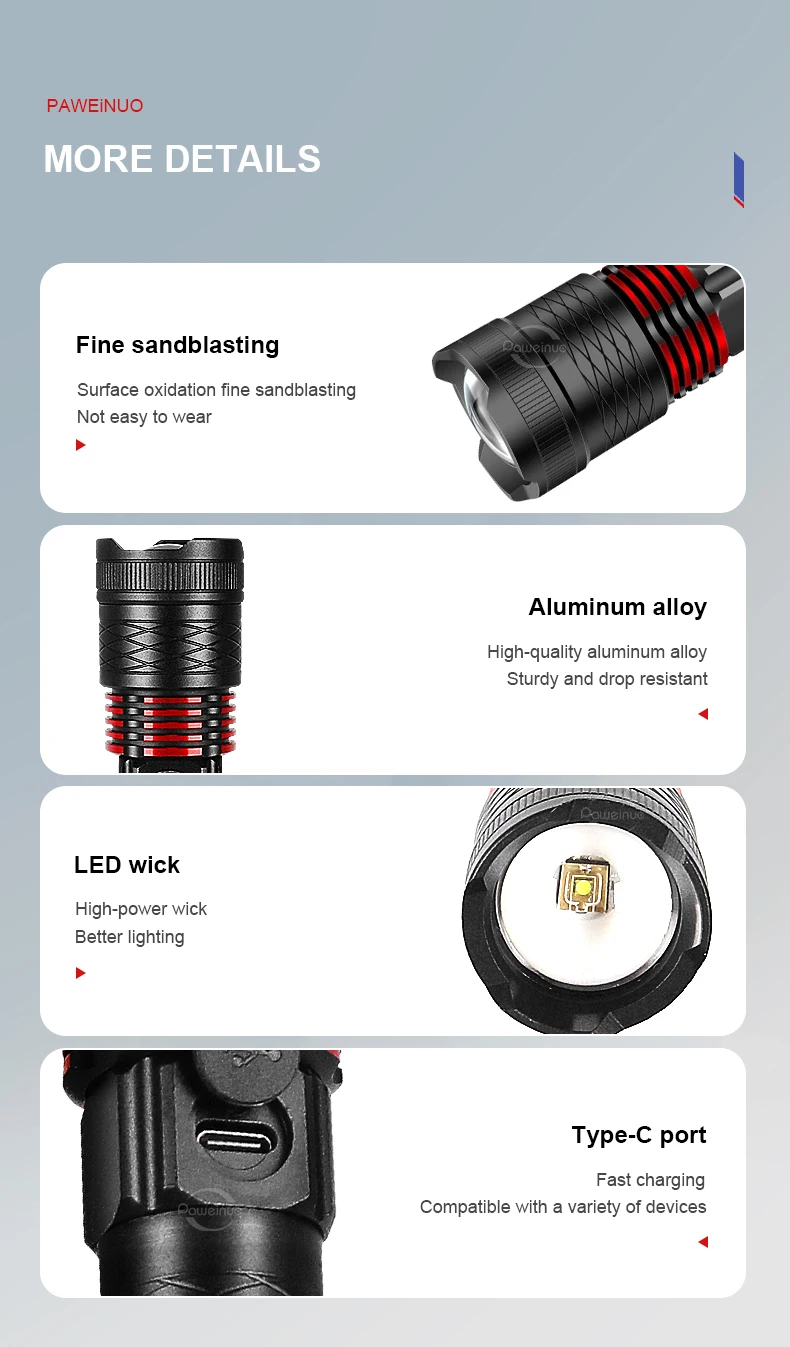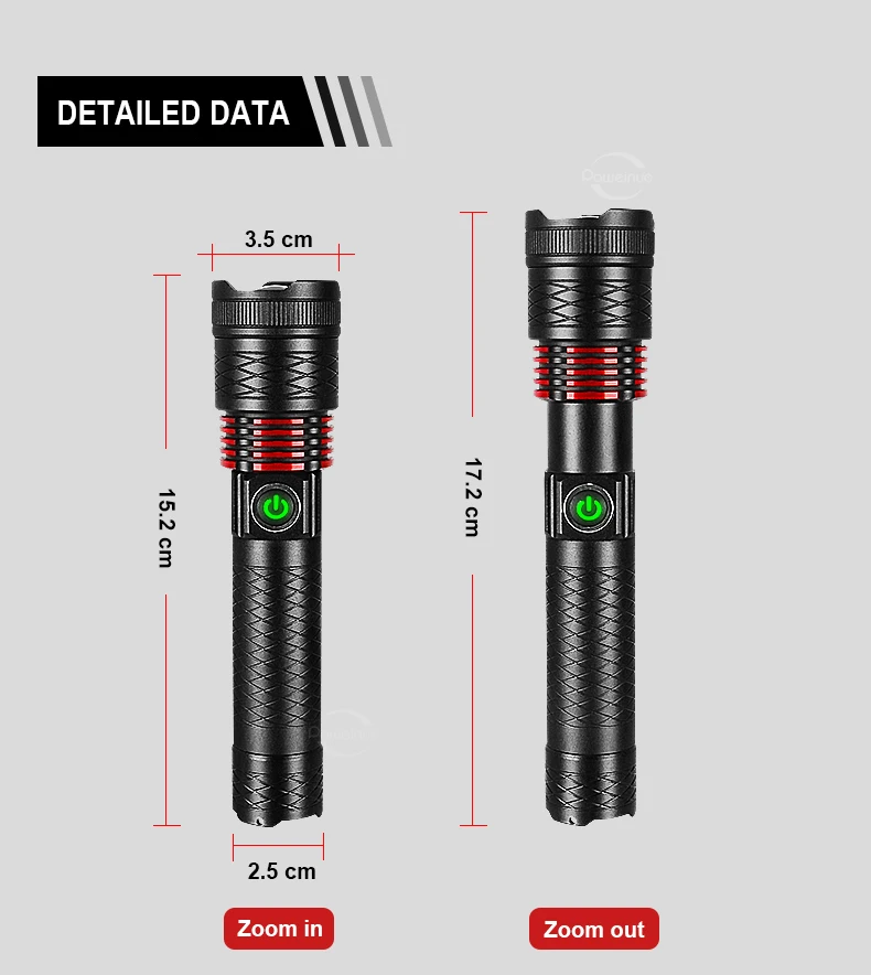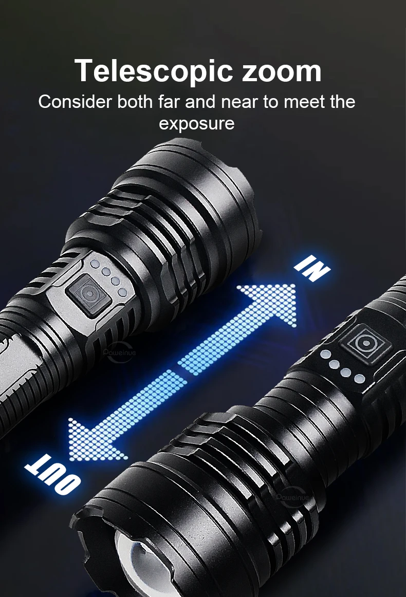 4. IP6 waterproof level, it can be used normally in heavy rain, but please do not use it for diving. The lamp head is retractable and zoomable, suitable for lighting in different scenes.