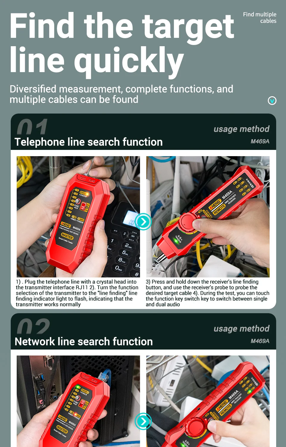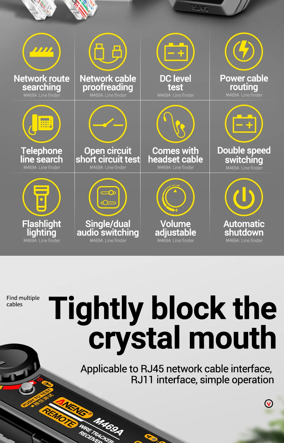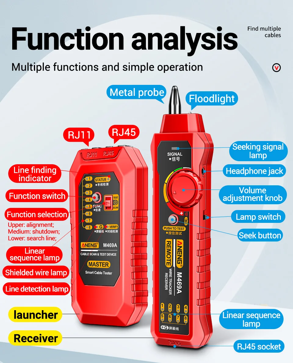 ANENG M469A Smart Network Cable Tester RJ45 RJ11 LAN Cable Tester Finder Wire Tracker Receiver Network Repair Electrical Tool