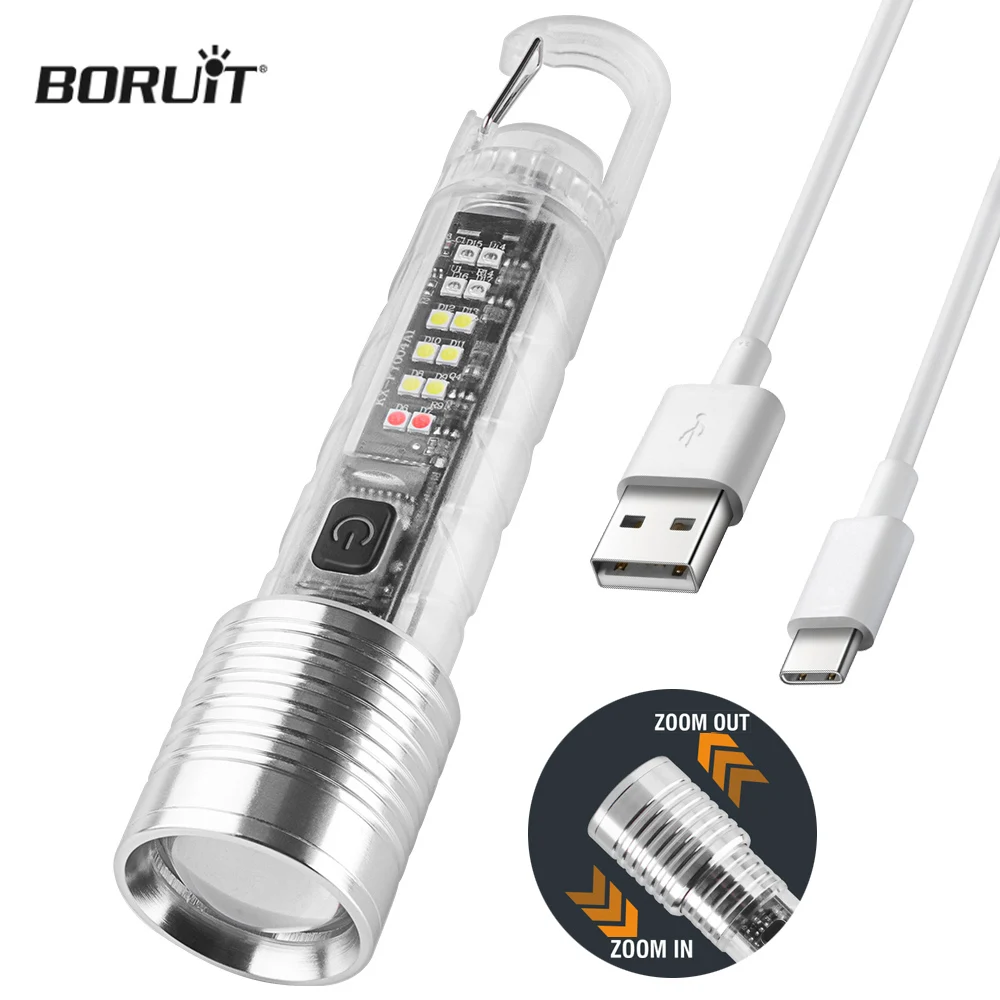 BORUiT Mini Flashlight Keychain Super Bright Zoom Rechargeable Torch Outdoor Emergency Camping Fishing Work Lights UV Tiki Lamp