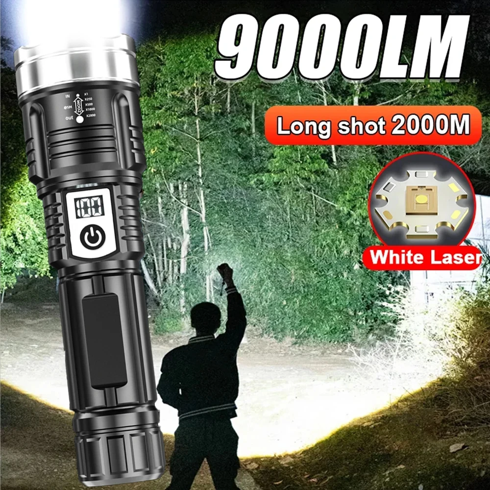 Powerful White Laser LED Flashlight Built-in Battery USB Rechargeable Zoom Torch With Power Display Outdoor Tactical Flashlights