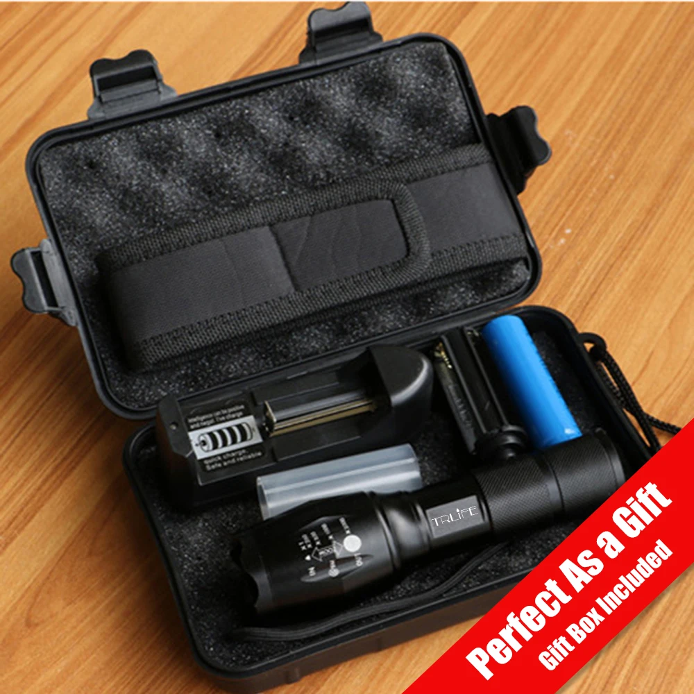 As gift for your families or friends Portable and easy to carry ●T6/L2/V6 Flashlight ●18650 Rechargeable Lithium Ion Battery ●18650 Battery Sleeve ●Battery Charger(EU/AU/US/UK) ●Flashlight Nylon Case ●AAA Battery Holder ●Gift Box