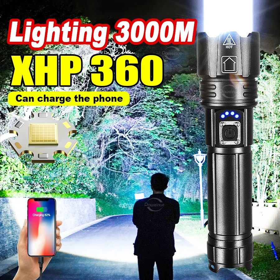 Super Powerful XHP360 LED Flashlight Type-c Rechargeable USB Flashlights High Power Long Range Zoom Torch Light Working Hunting