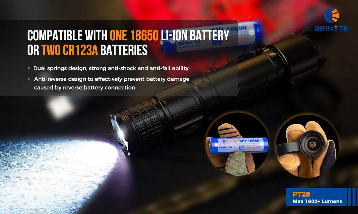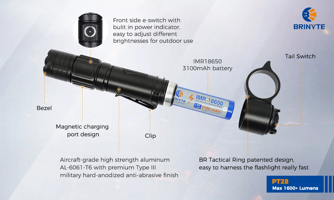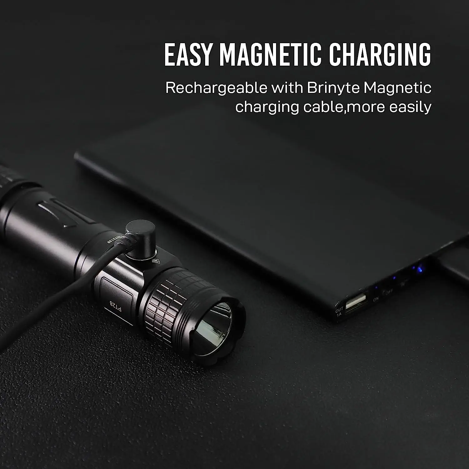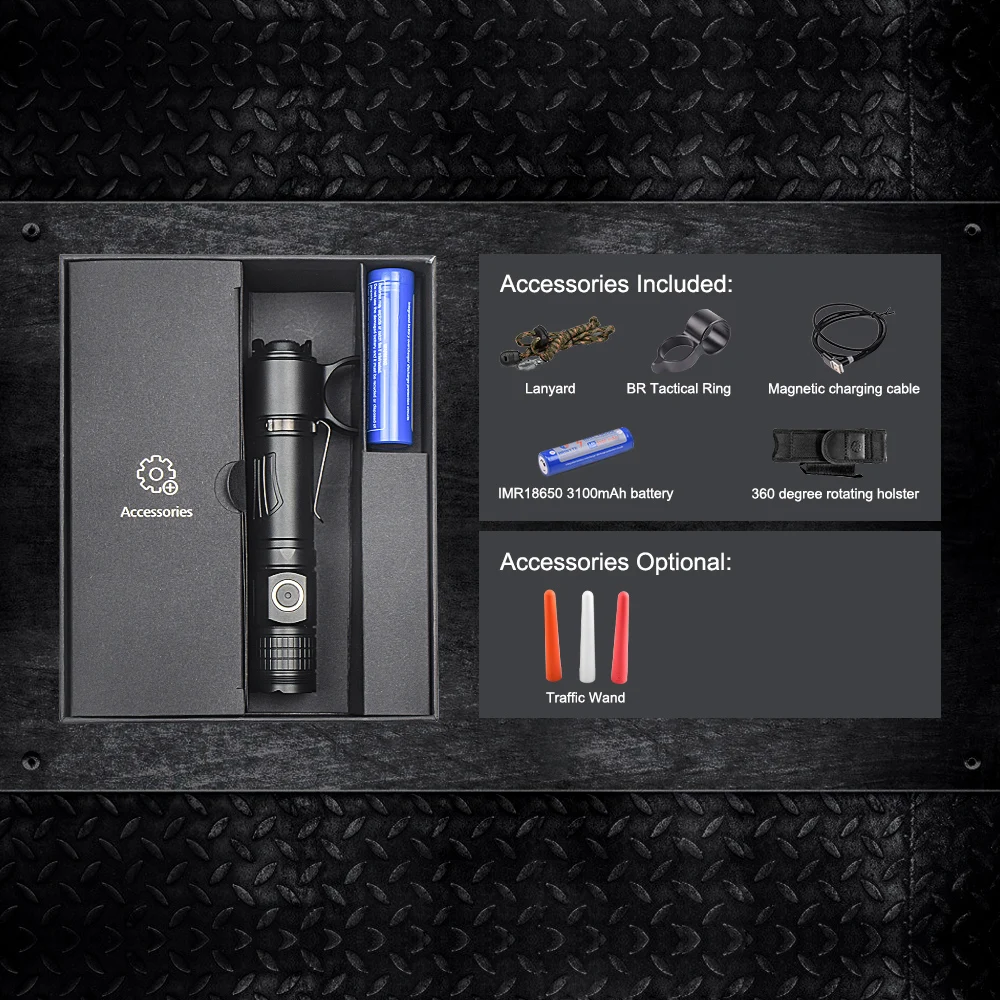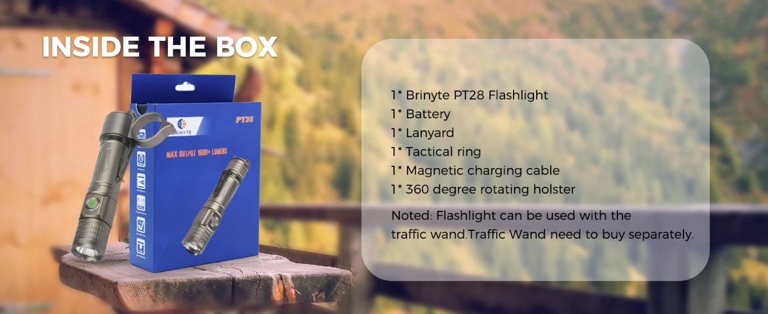 【WHAT YOU GET】- Brinyte PT28 flashlight, tactical ring, rechargeable battery, braided charging cable, duty belt holster, lanyard, O-rings, our timely customer service and a 24-month warranty