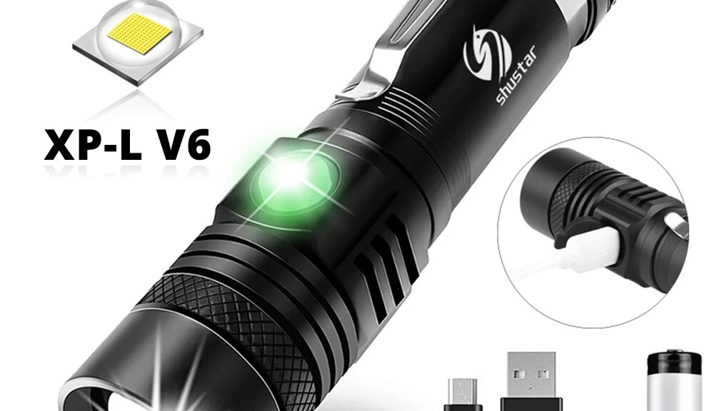 Price: Note:Package A does not include batteries, if you need batteries, please purchase packages B, E Basic product parameters: Brand: ShustarModel: S-029Application: Riding, daily lighting, camping, emergency and so onColor: BlackSize: 12(length) * 2.7(head diameter) * 2.4(tail diameter)Gross weight: 93gLight source form: LEDPower supply: Micro USB direct chargeFlashlight Material: Aluminum AlloyBattery: 1 x 3.7V 18650 lithium batteryGear: Third gear, strong light – weak light – flashLumens: 2000 lumensSwitch: Button High-Grade Material and Function:Adopting Bright T6/L2/V6 Bright Bulbs of highly efficient materials and proprietary substrates are used to deliver a truly superior color, performance, efficiency, and intensity. Other types of LEDs cannot compare. Features: 1. Easily light up an entire room or focus in on objects up to 300M away! 10 times brighter than old incandescent lights. 2. durable new shell, wear-resistant, waterproof, very lightweight. Weighs only 4.35 ounces. life expectancy of up to 100,000 hours. 3. charge your LED flashlight anywhere, anytime to light up your environment and keep you on the go. 4.There are 3 light patterns, ready for you to adjust to the light you need. Each press can switch a mode, simple and convenient. Packaging list: Package A:1 x LED flashlight1 x Micro USB charging cable Package B:1 x LED flashlight1 x Micro USB charging cable1 x Shustar 3.7V 18650 lithium battery Package E:1 x LED flashlight1 x Micro USB charging cable1 x Shustar 3.7V 18650 lithium battery1 x charging cable connector Please note the following as you use your device:1.Remove the plastic wrap off the batteries at first-time use, to charge successfully.2.Place the battery correctly, regarding the positive and negative pole.3.When the battery is charging, the indicator light on the charger will be red and after completely charged, the indicator light will turn green. Thank you for choosing our products, our shustar products are produced under very professional quality inspection. If you have any questions, Please contact our! Clip design, easy to carry Multiple charging methods When charging, it lights up red. After the battery is fully charged, it lights up in green. Telescopic zoom for lighting needs in different occasions IP65 waterproof rating, normal use on rainy days, but not for diving
