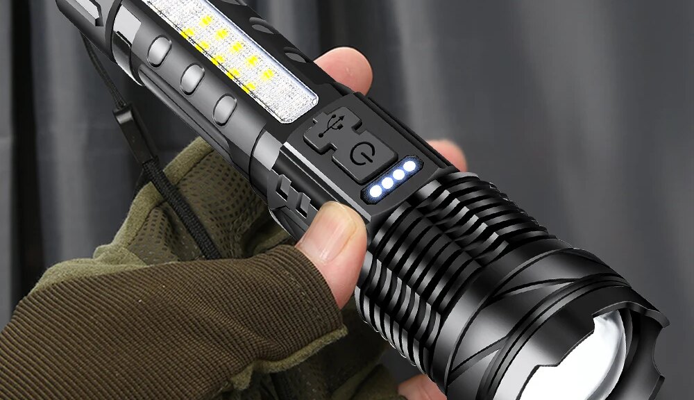 Powerful LED Flashlight Portable USB Rechargeable Torch 7 Lighting Modes Zoomable Waterproof Outdoor Camping Supplies Light