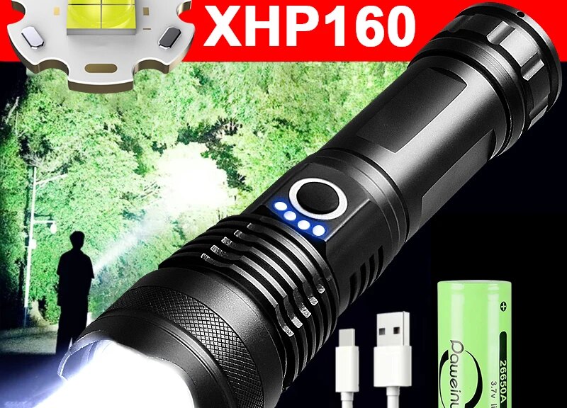 High Power LED Flashlight XHP160 Super Bright USB Rechargeable Torch 26650 Zoom Powerful Flash Lights Camping Tactical Lanterns