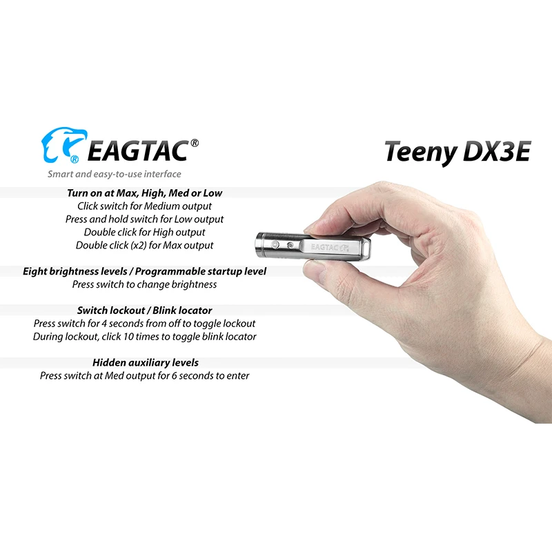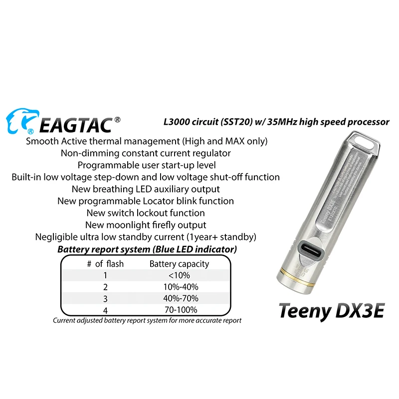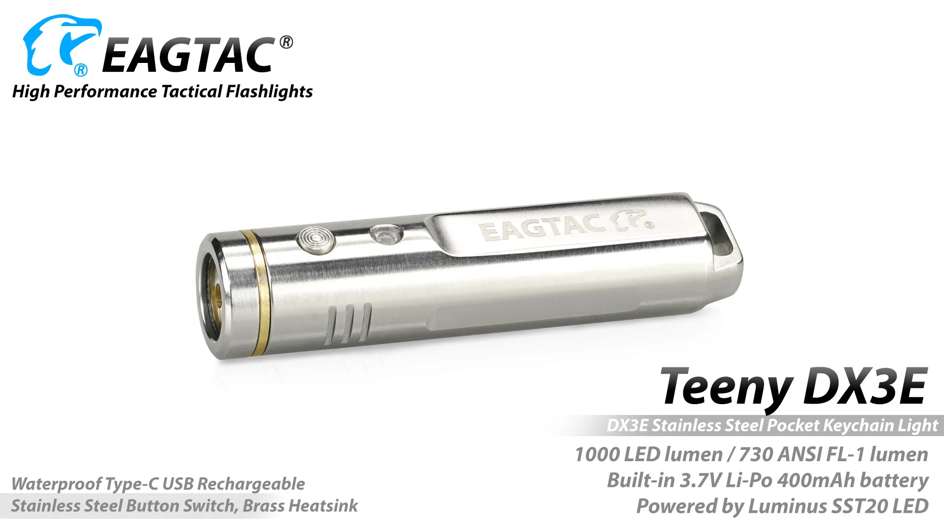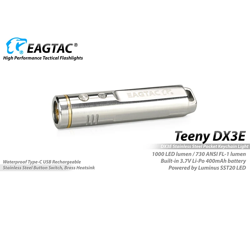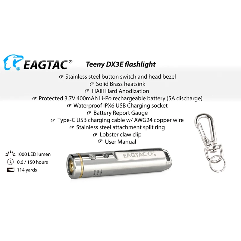 Teeny DX3E Keychain – features waterproof type-C charging socket, 1000 led lumen, stainless steel switch button and head bezel with HAIII hard anodized body, built-in 400 li-po high capacity battery, 8 programmable brightness levels and 7 hidden auxiliary levels.