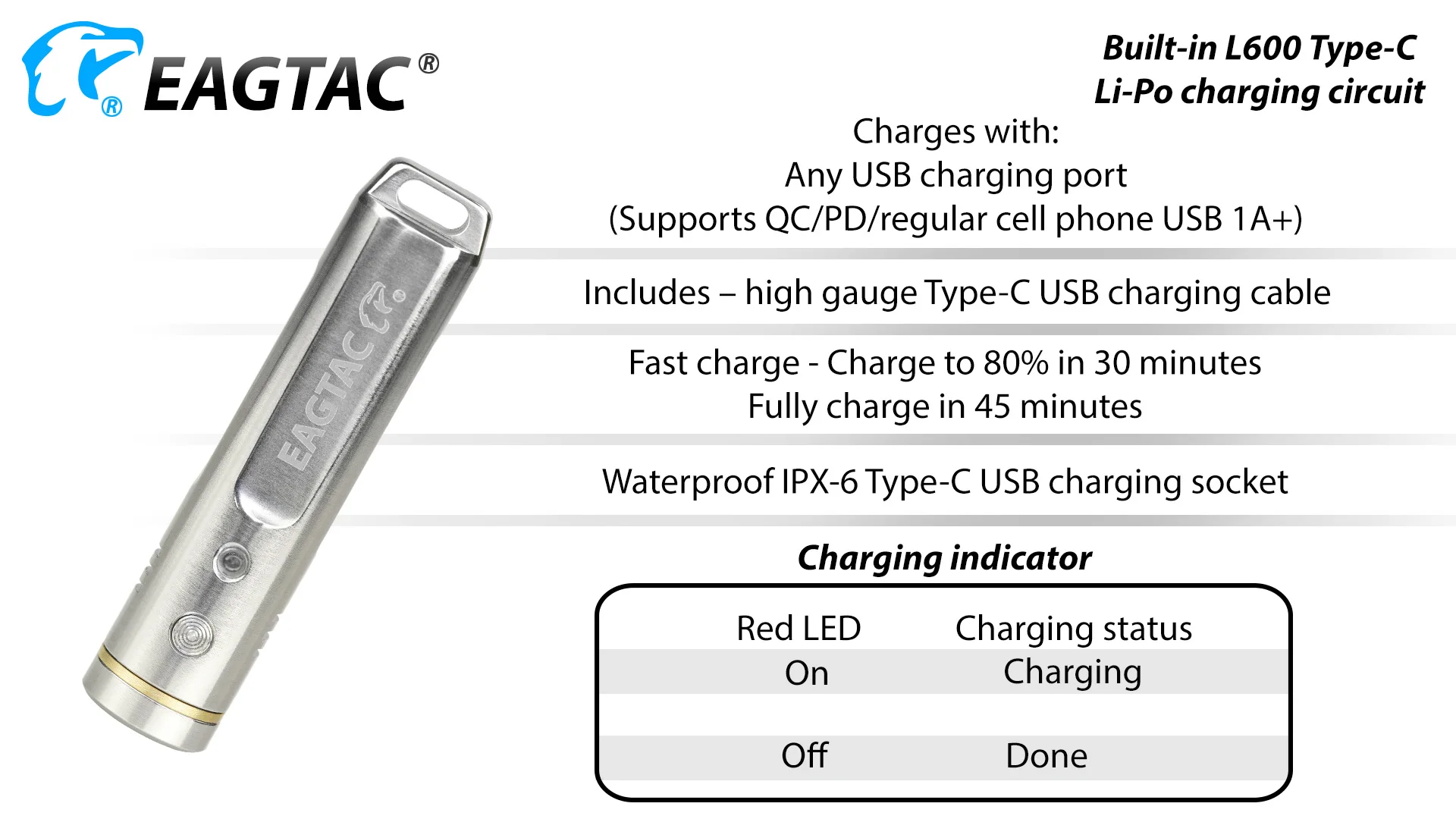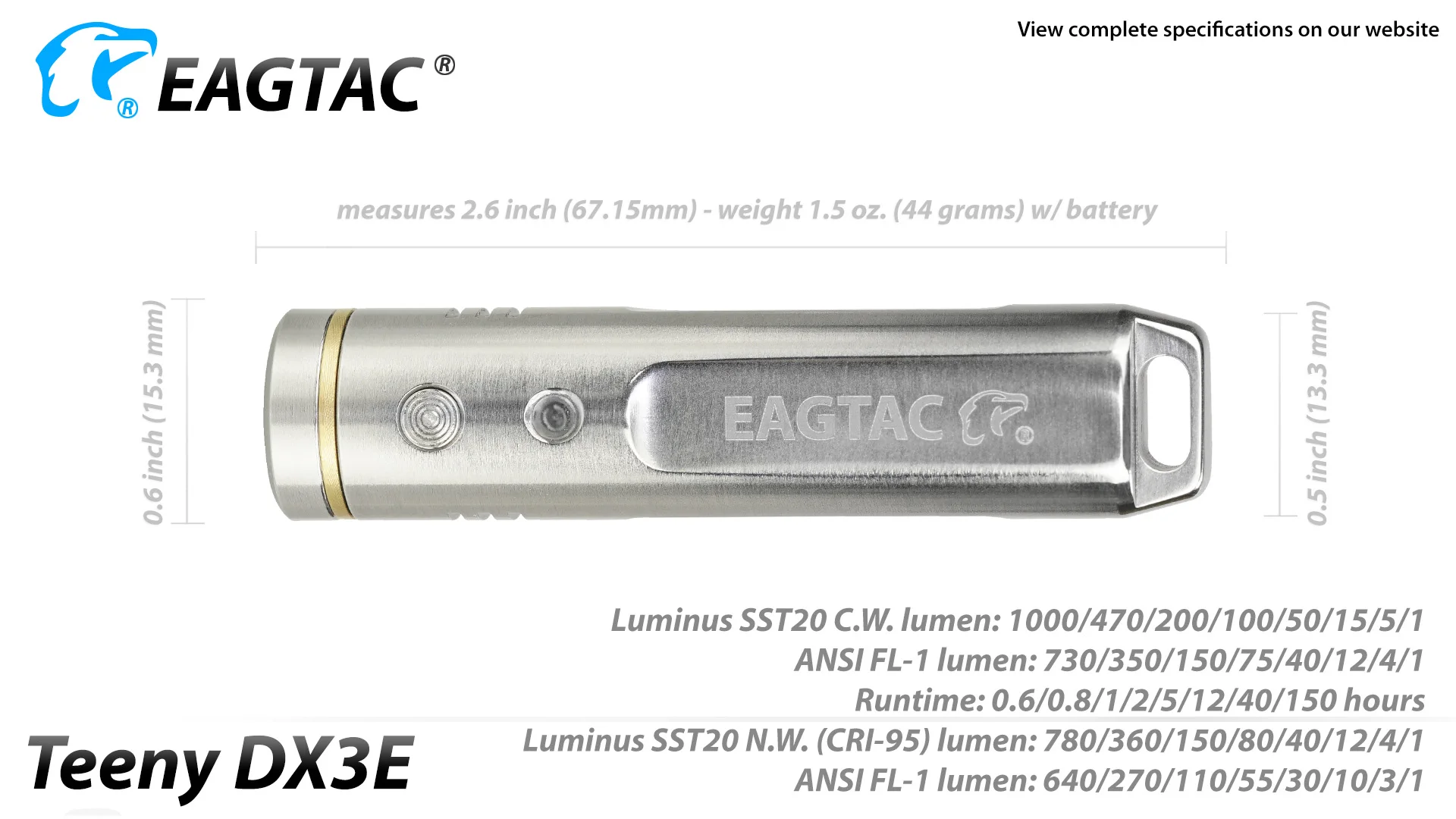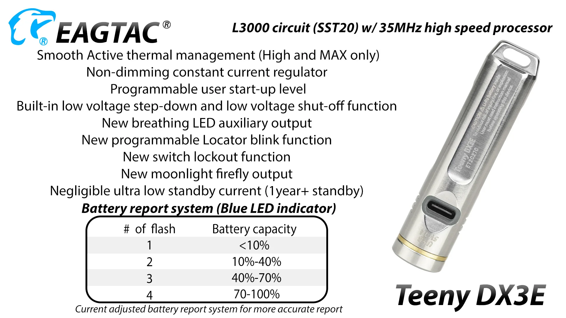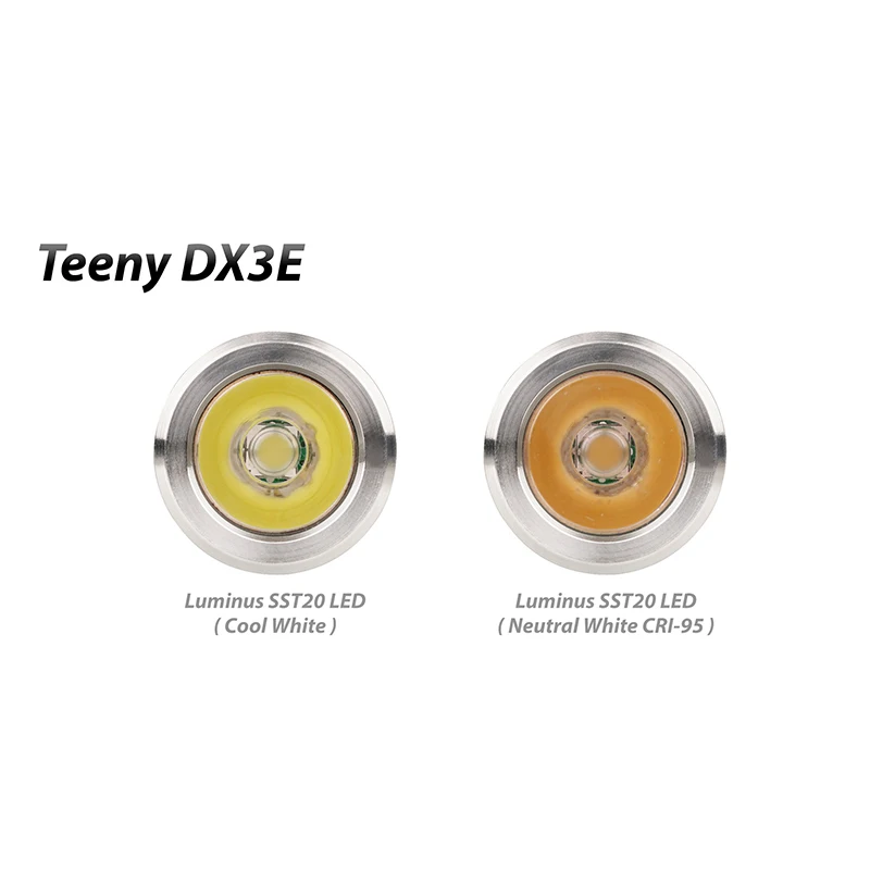 Teeny DX3E Keychain – features waterproof type-C charging socket, 1000 led lumen, stainless steel switch button and head bezel with HAIII hard anodized body, built-in 400 li-po high capacity battery, 8 programmable brightness levels and 7 hidden auxiliary levels.