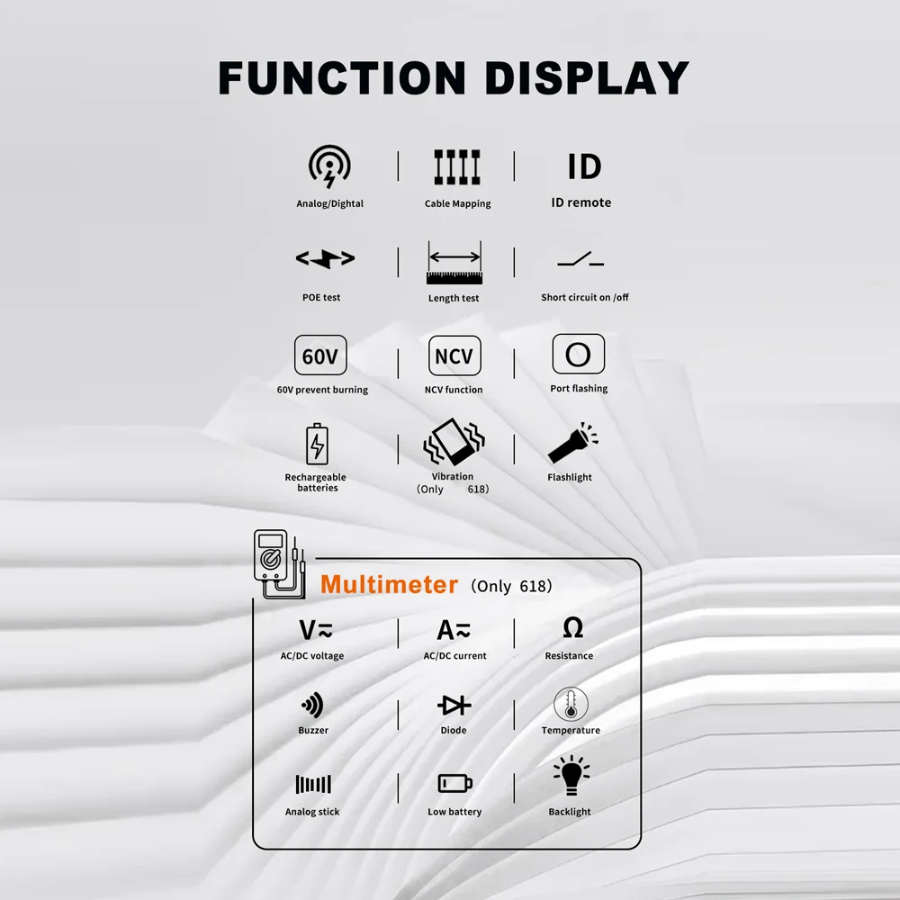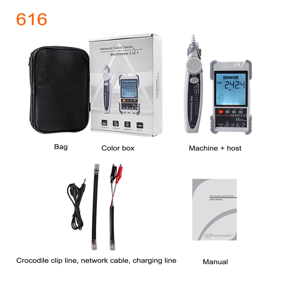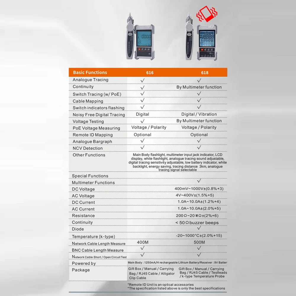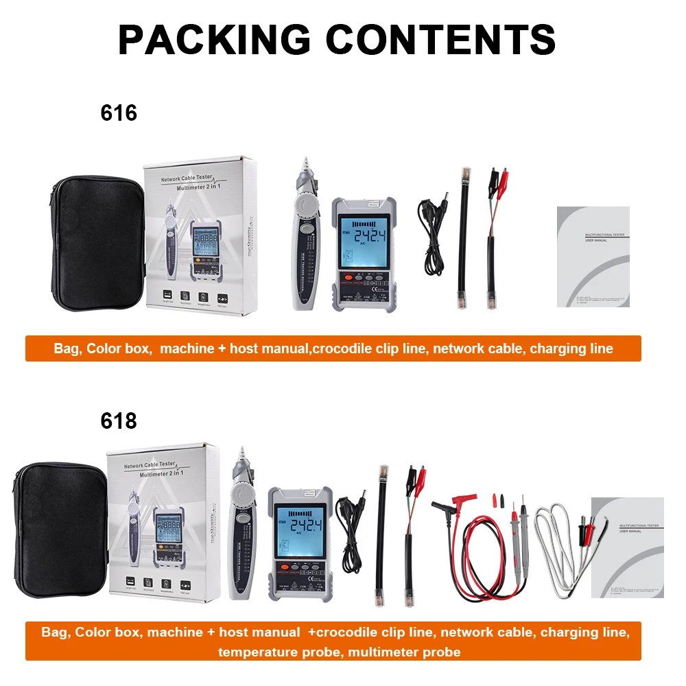 ET616/ET618 Optional: There are two different types for you to choose. The network cable length measuring ranges of ET616 is 400M, and the ranges of ET618 is 500M. Only ET618 has the multimeter functions.