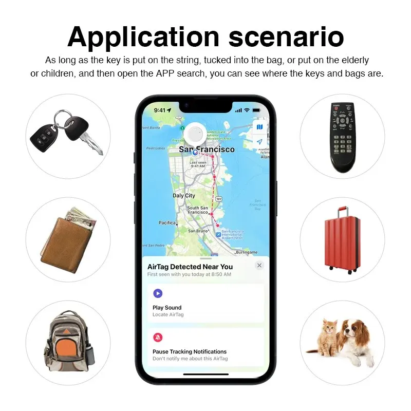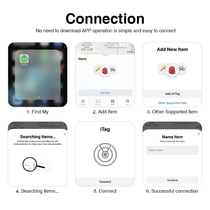 4.Your i-Tag sends out a secure Wireless signal that can be detected by nearbydevices in the Find My network. These devices send the location of your i-Tagto iCloud then you can go to the Find My app and see it on a map. The wholeprocess is anonymous and encrypted to protect your privacy.
