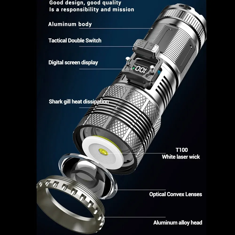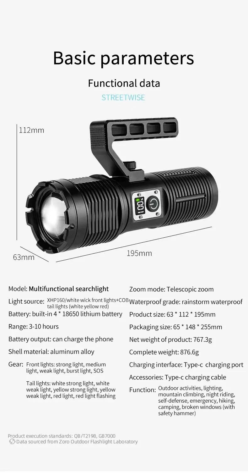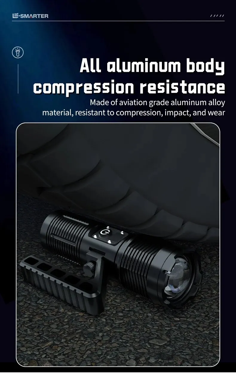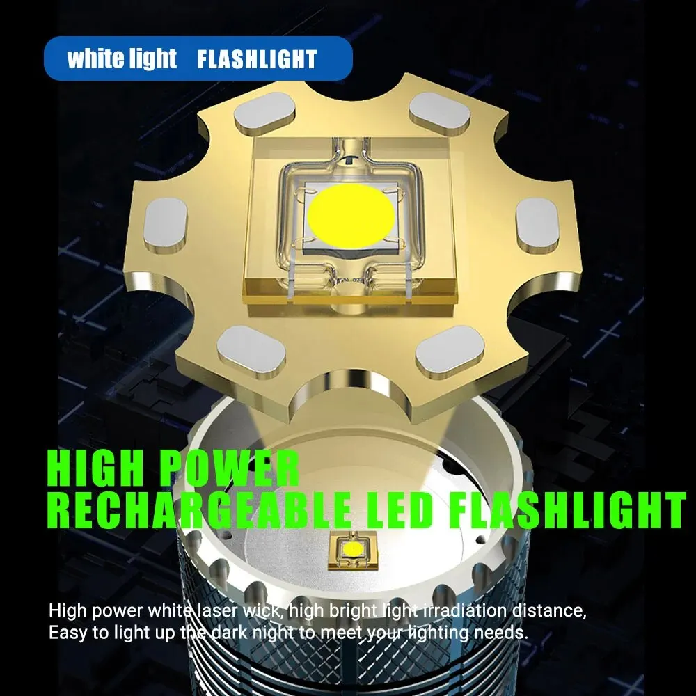 Features: 16-core high-power wick(or White Laser wick), emergency rechargeable treasure, LCD digital power display, telescopic zoom, removable handle, metal head can break the window, red warning light