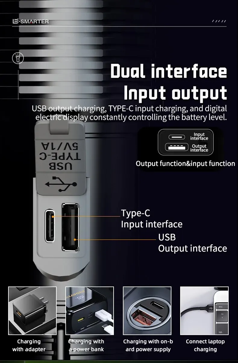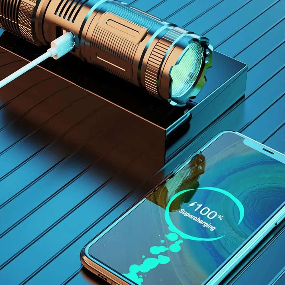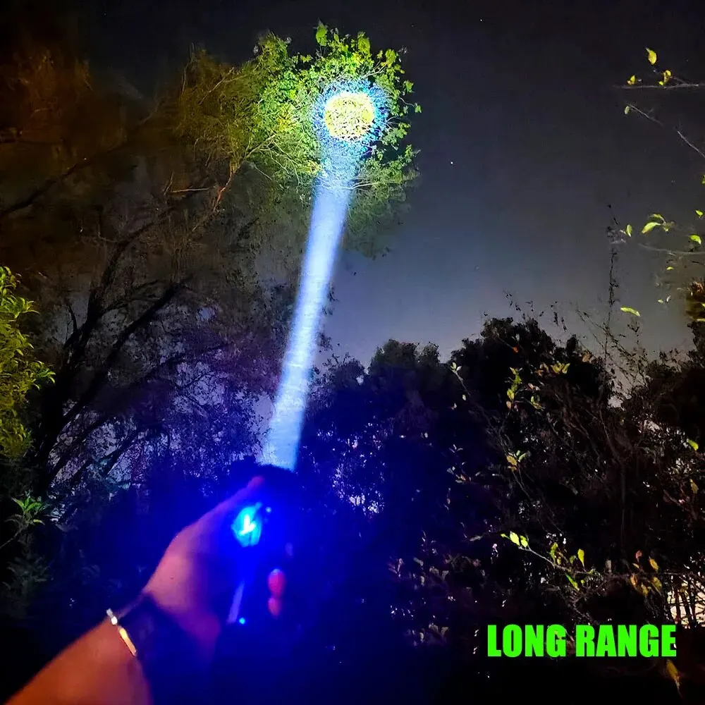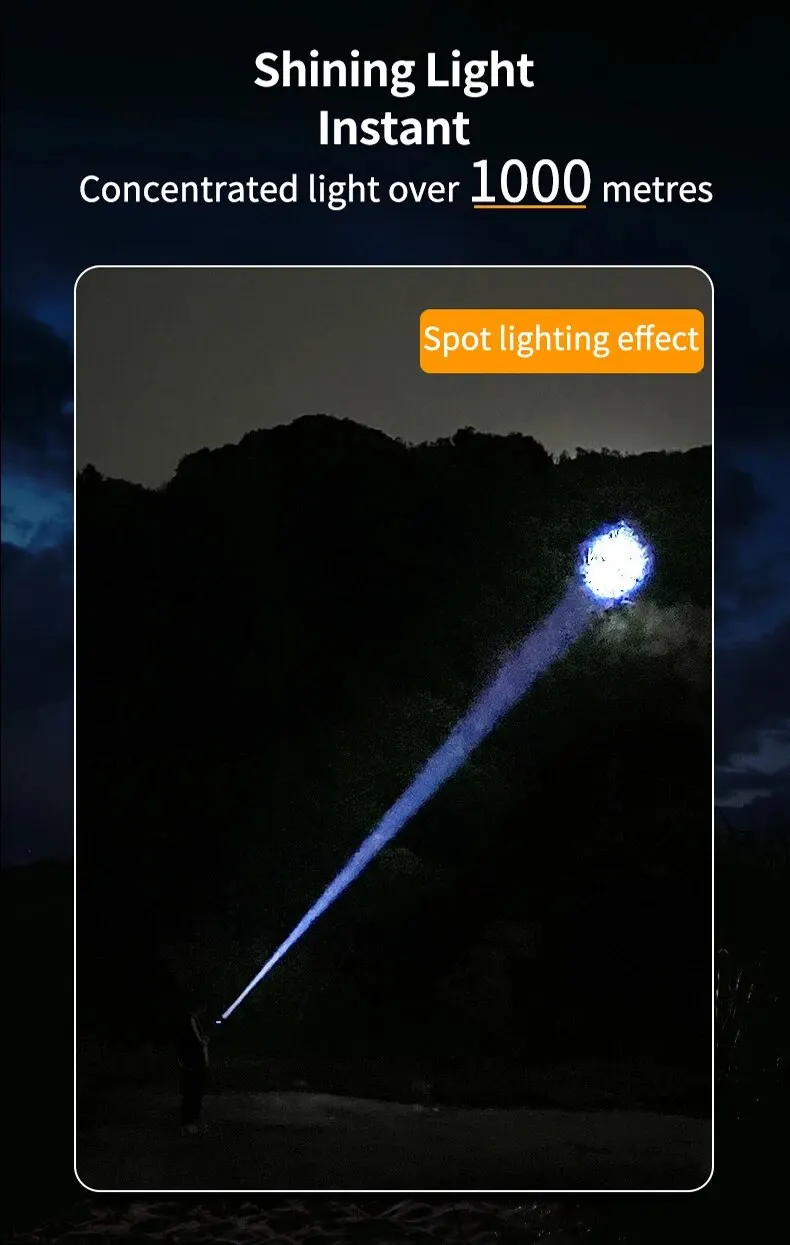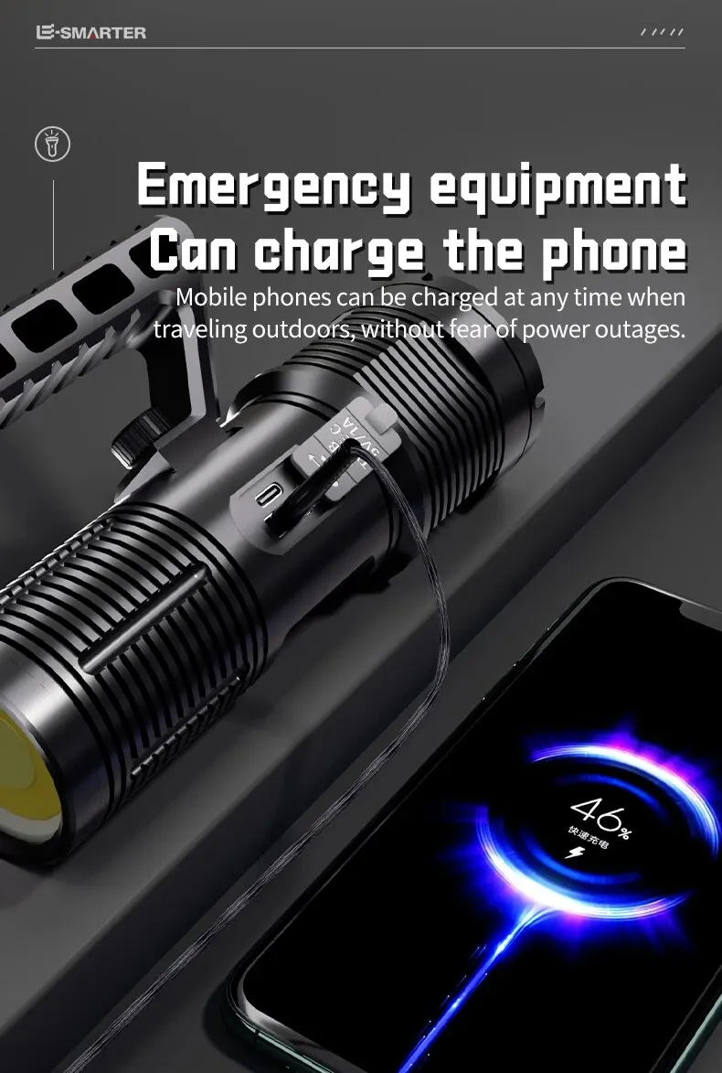Features: 16-core high-power wick(or White Laser wick), emergency rechargeable treasure, LCD digital power display, telescopic zoom, removable handle, metal head can break the window, red warning light