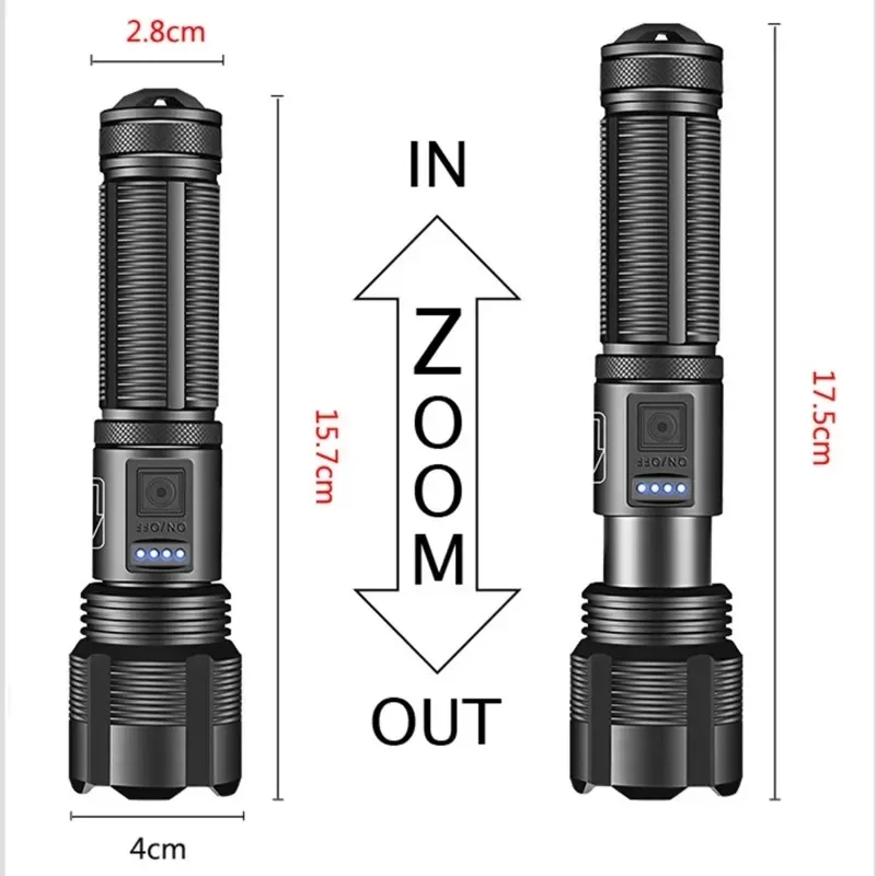 5-Switch mode: High light–Medium light–Low light–Strobe–SOS