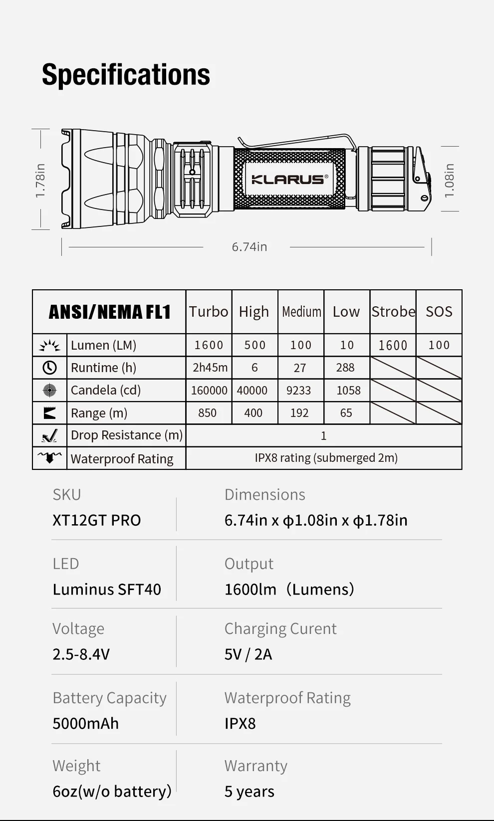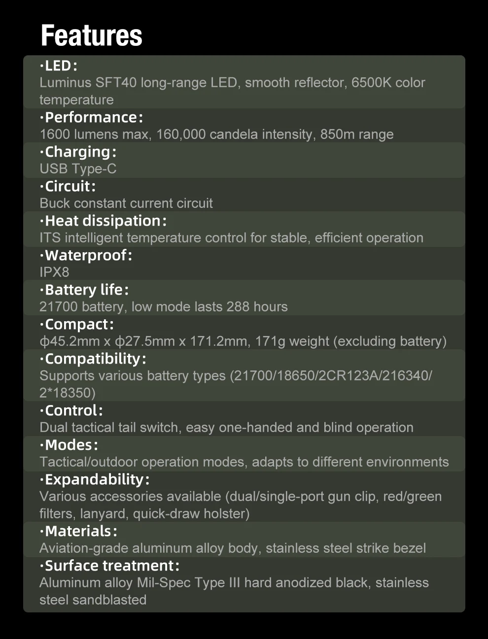 6.LED:Luminus SFT40 long-range LED, smooth reflector, 6500K color temperature