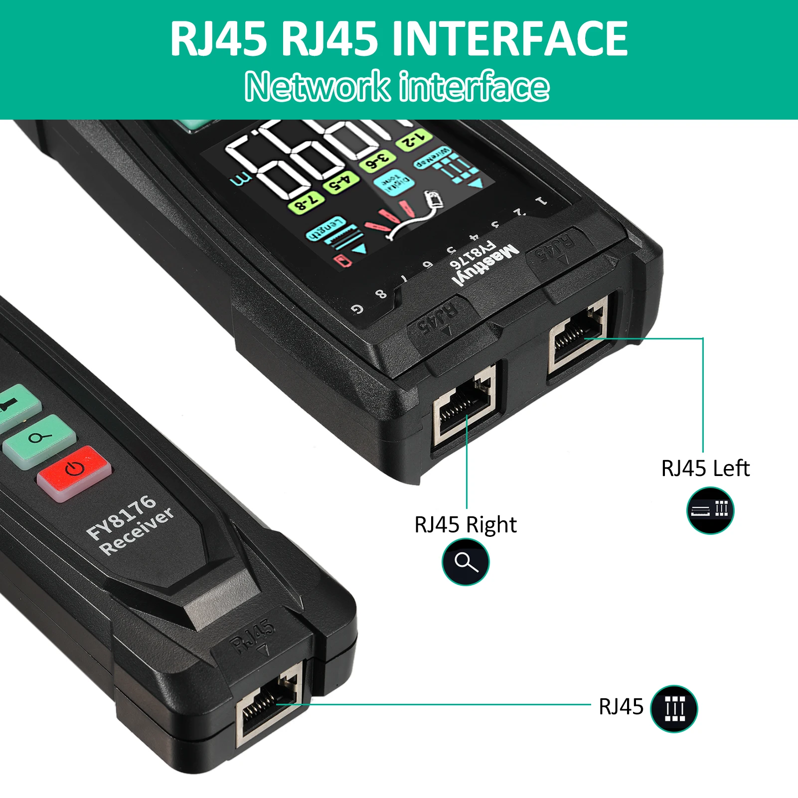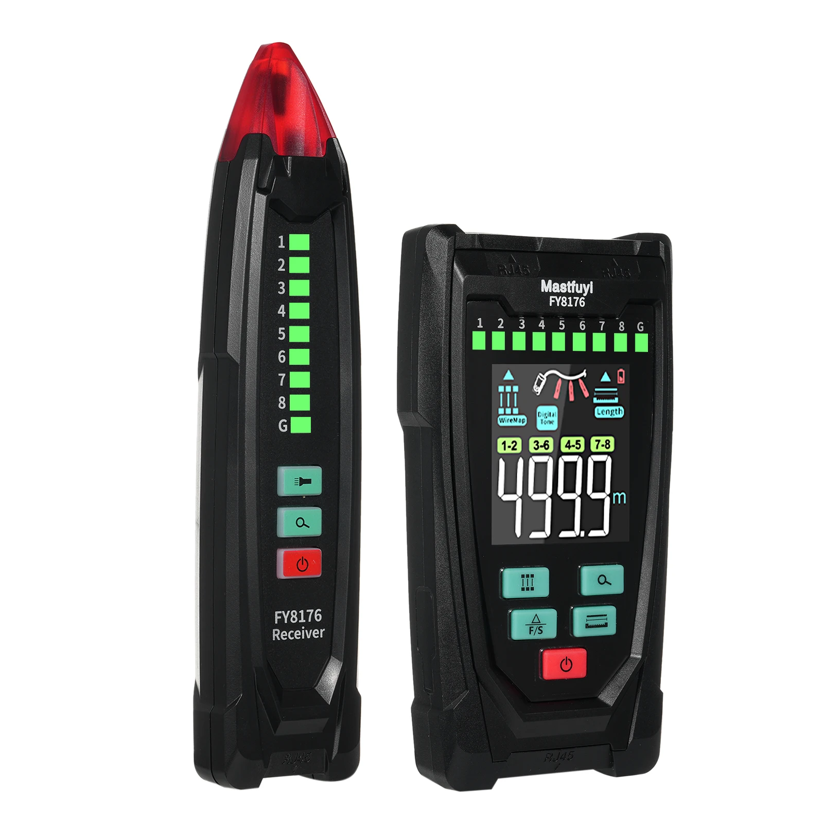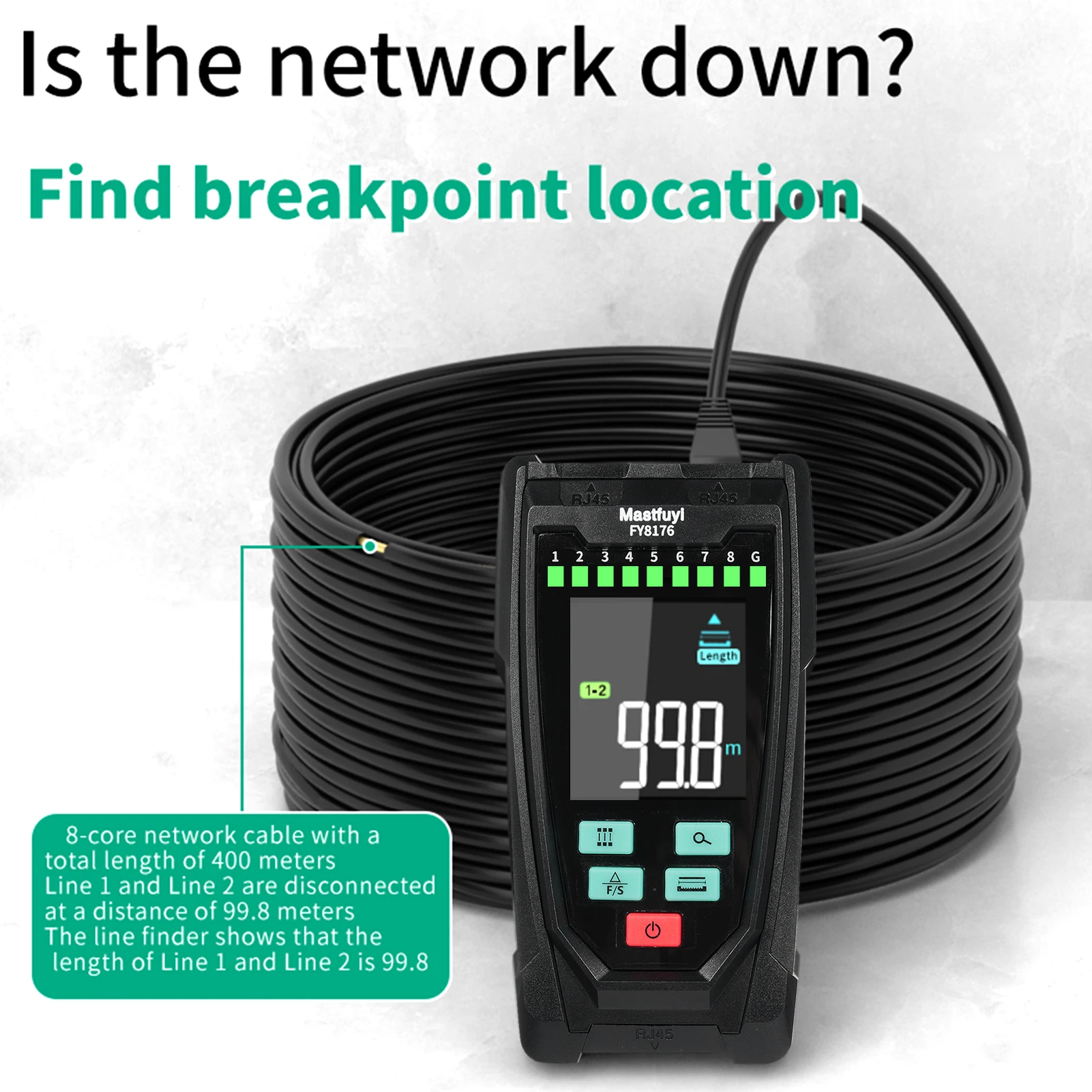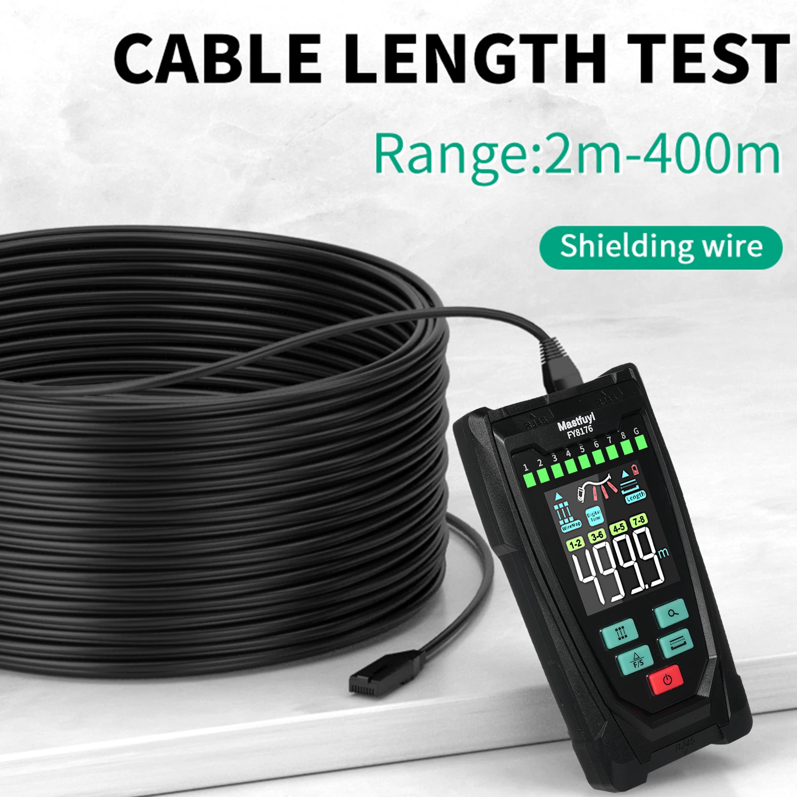 【Length Measurement/Fault Distance Location】FY8176 Network Tester use TDR (Time Domain Reflectometry) technology to measure the length and fault point of network cable/telephone cable/BNC coaxial cable without calibration, fast response, high accuracy, wide range, measuring distance up to 400m/1312ft, support length unit ft/m switching. Note: Must be measured in open circuit.
