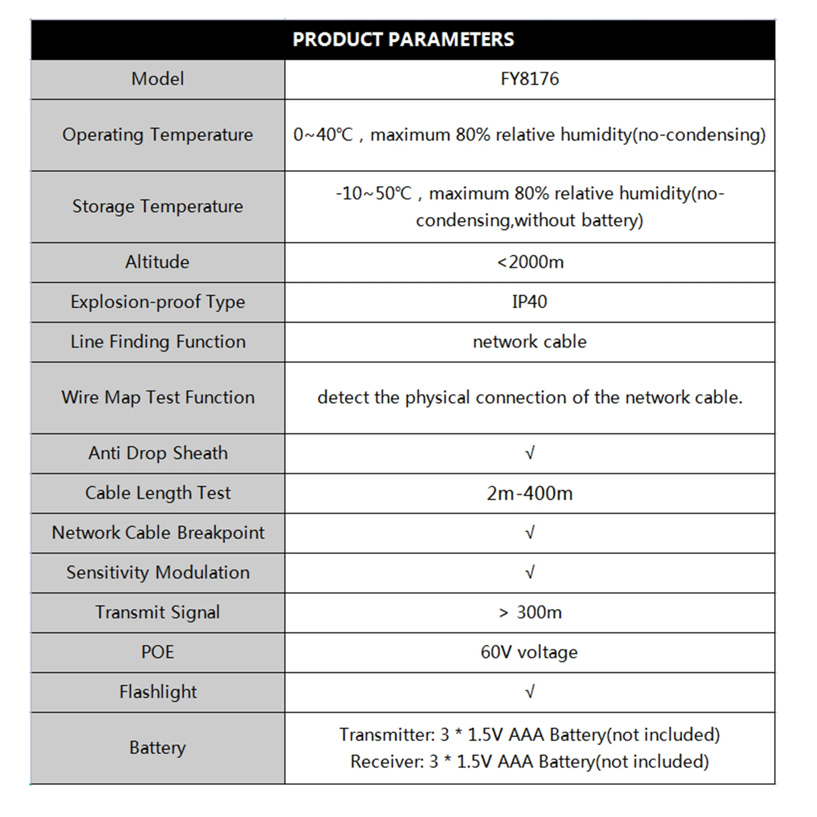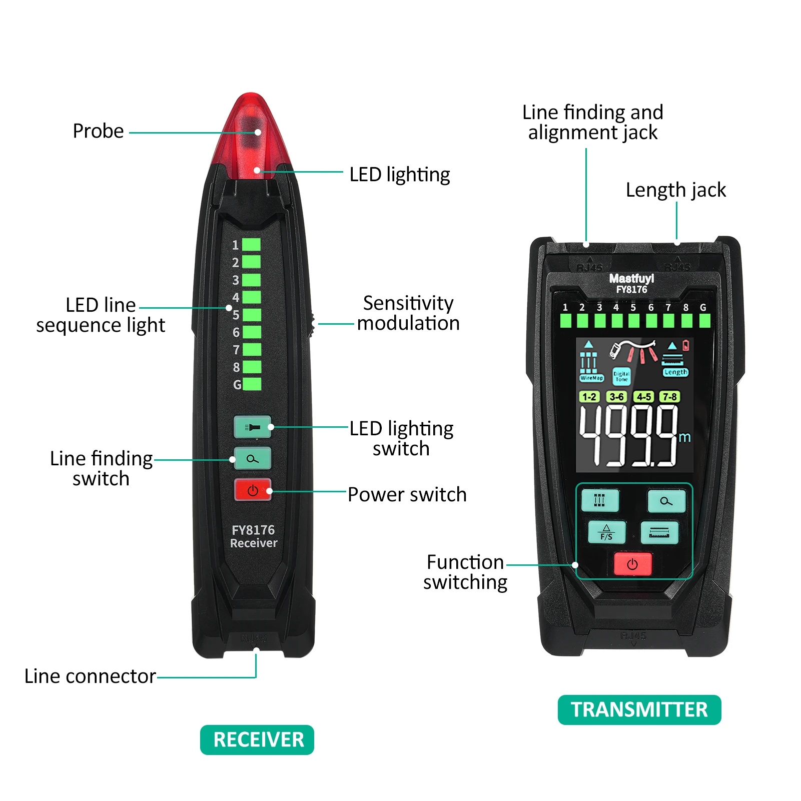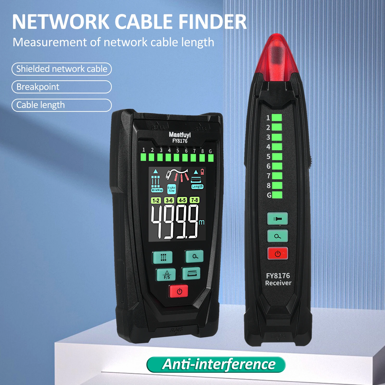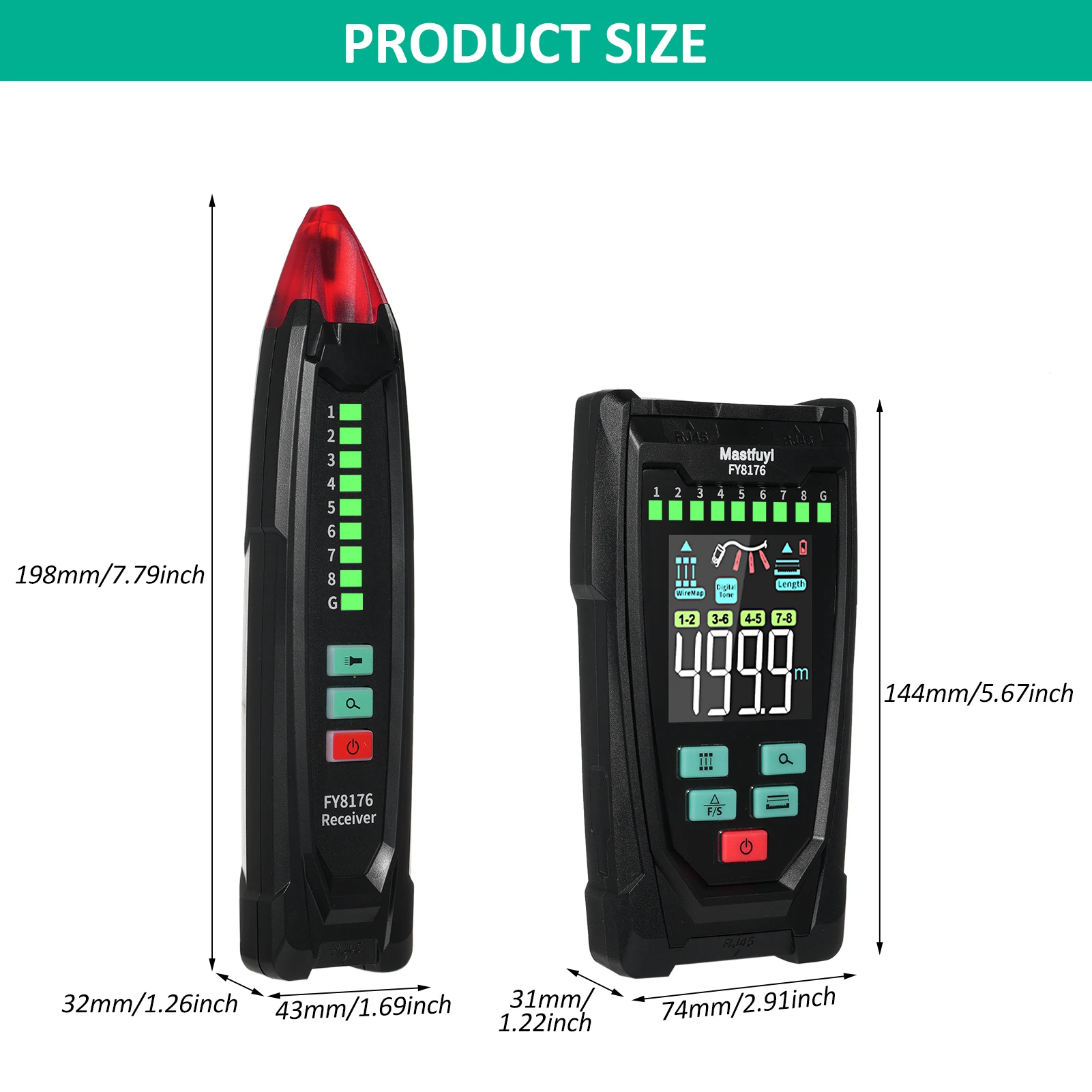 【Length Measurement/Fault Distance Location】FY8176 Network Tester use TDR (Time Domain Reflectometry) technology to measure the length and fault point of network cable/telephone cable/BNC coaxial cable without calibration, fast response, high accuracy, wide range, measuring distance up to 400m/1312ft, support length unit ft/m switching. Note: Must be measured in open circuit.