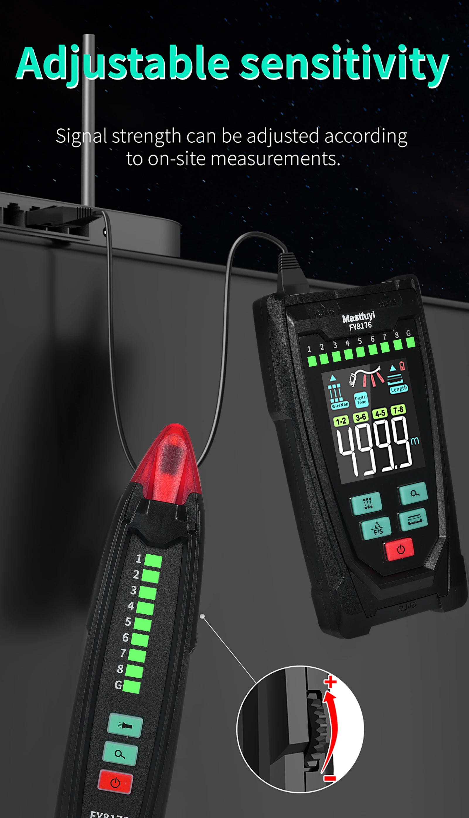 【Anti-interference Digital Cable Scanning】Adopting advance digital cable scanning technology, anti-interference, noiseless, high sensitivity, stronger and more stable than ordinary analog signal. The Ethernet Cable Tester can be used in all kinds of POE switches, and it supports 60V withstand voltage, which is more compatible. This instrument is suitable for RJ45 interface network cables, receiver sensitivity adjustable.