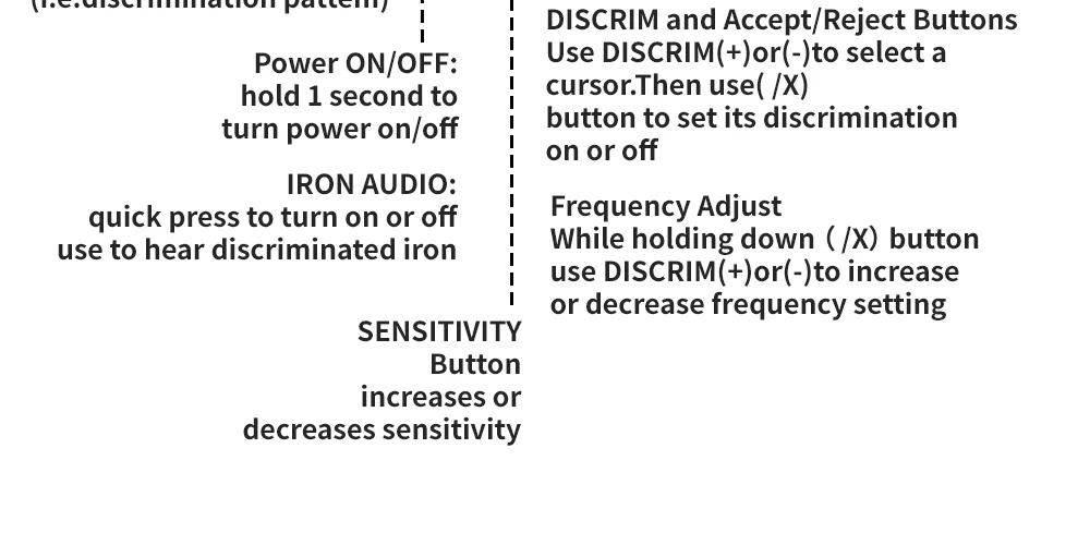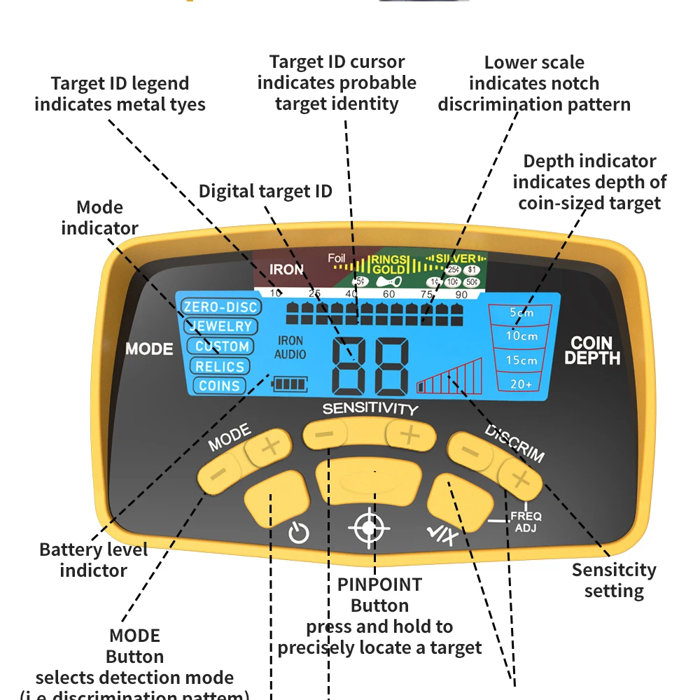 operation modes:All metal, Jewelry,custom,relics,coin,pinpointer.