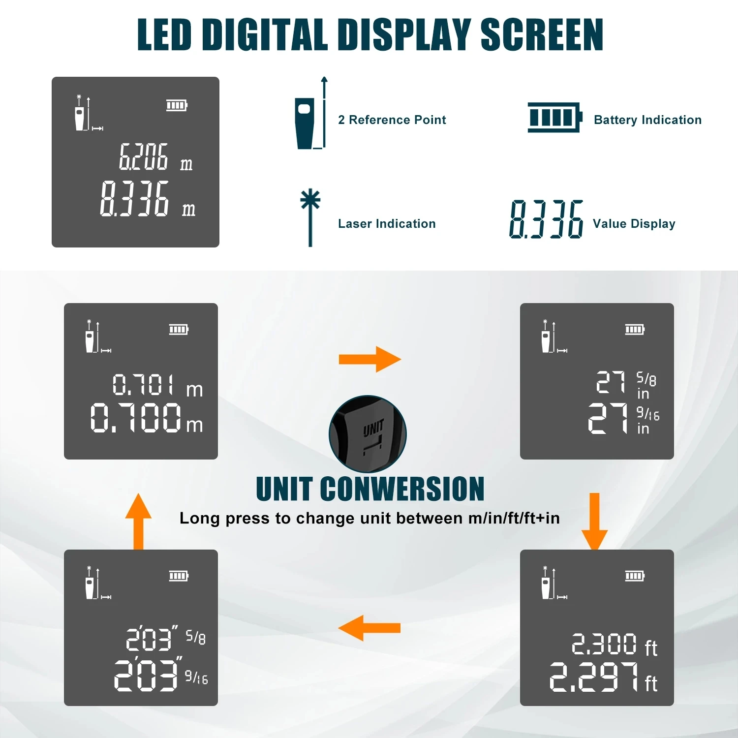 Unlike other traditional laser tape measures, this laser measuring tape adopted reverse display LCD, better visual impact, not easy to reflect. In addition, the high-quality magnetic hook can attach to any metal object sturdily, not only improving the stability of the user but also the accuracy of the measurement.