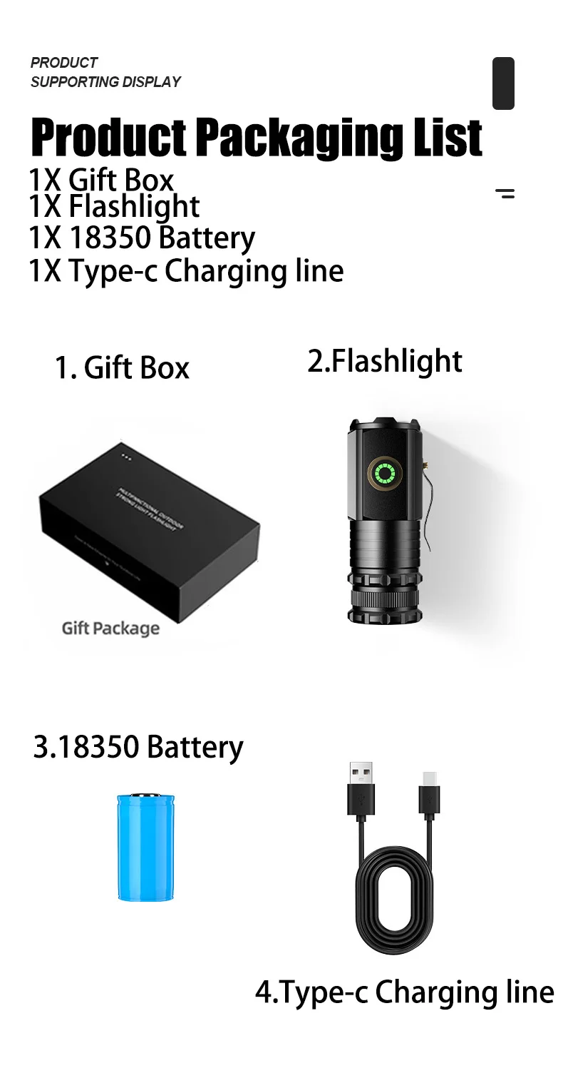 1*Flashlight + 1*18350 Battery+1*Type-C Charging data cable+1*Gift BoX(The packaging may be updated and may differ from the picture. Please understand)