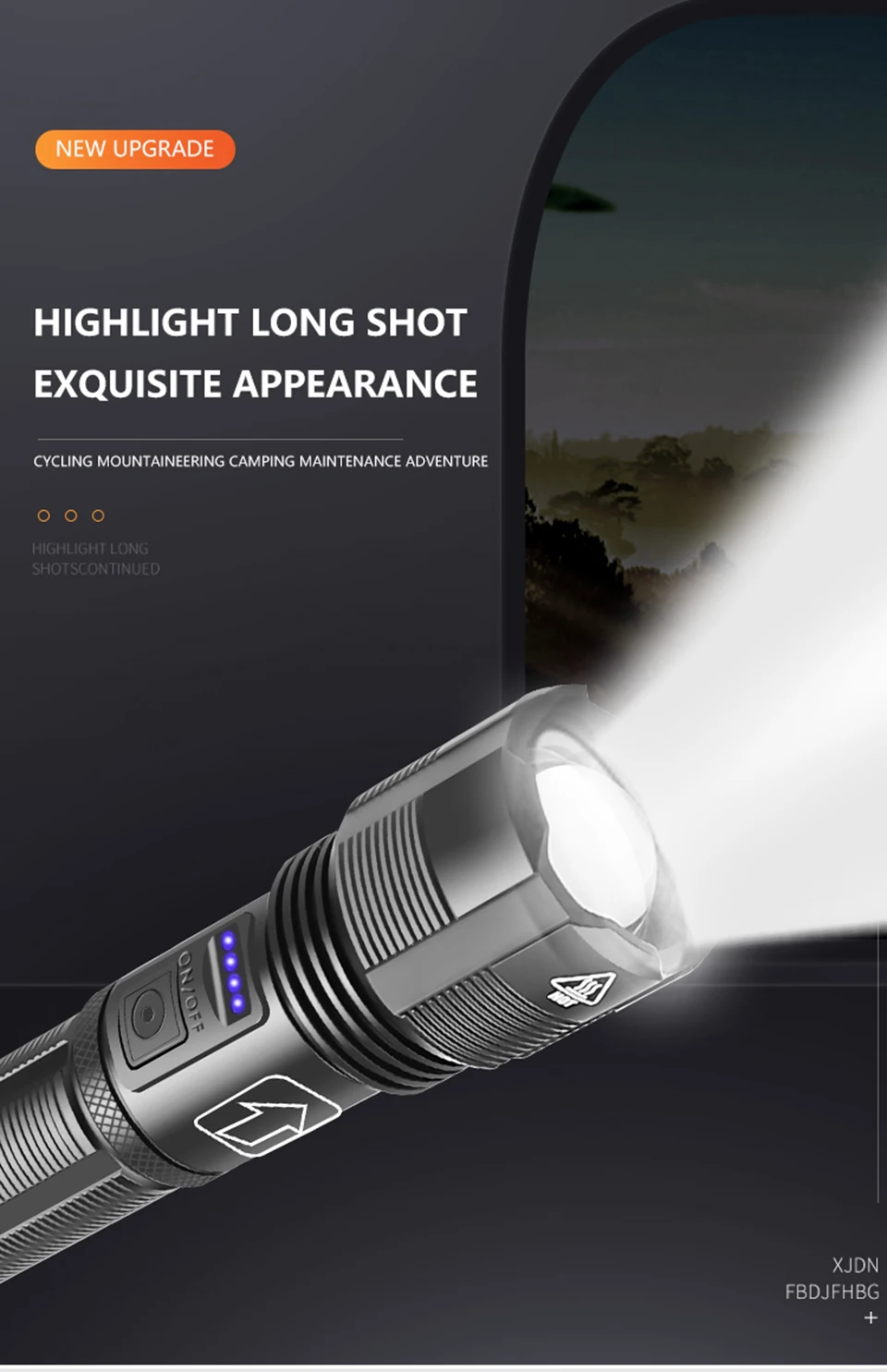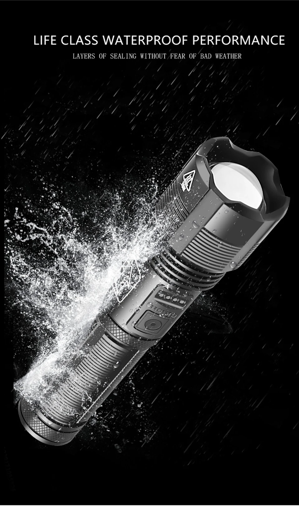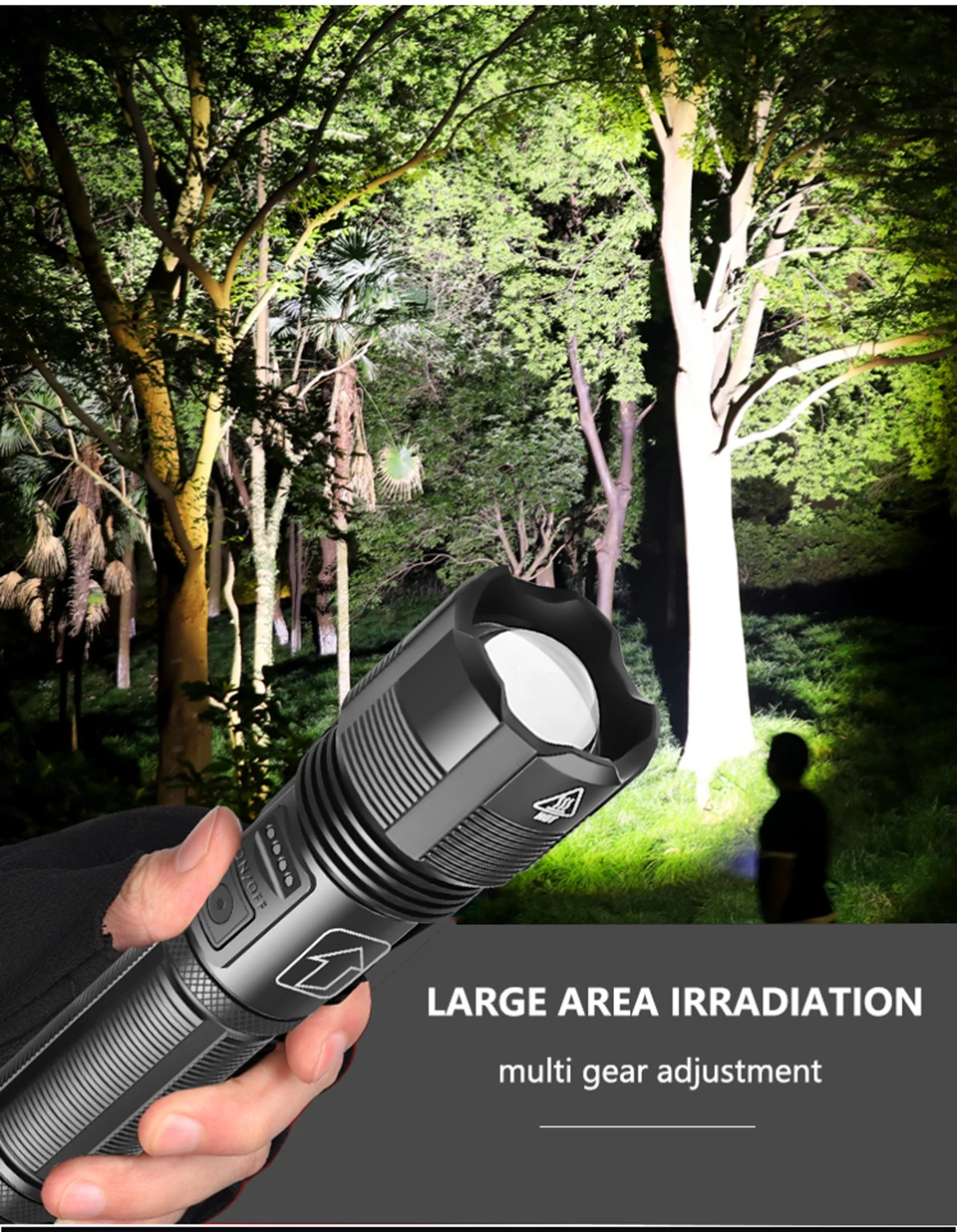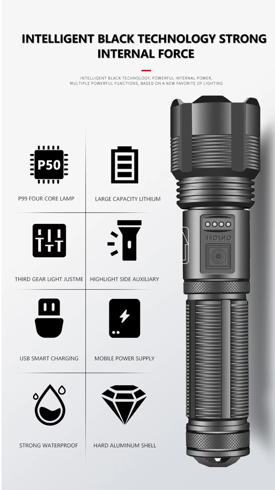 5-Switch mode: High light–Medium light–Low light–Strobe–SOS
