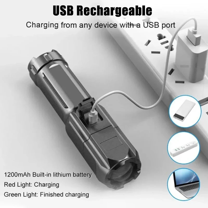• USB Rechargeable :With its USB rechargeable feature, you can easily charge the flashlight using a power bank or any other USB-enabled device, making it convenient to use on the go.