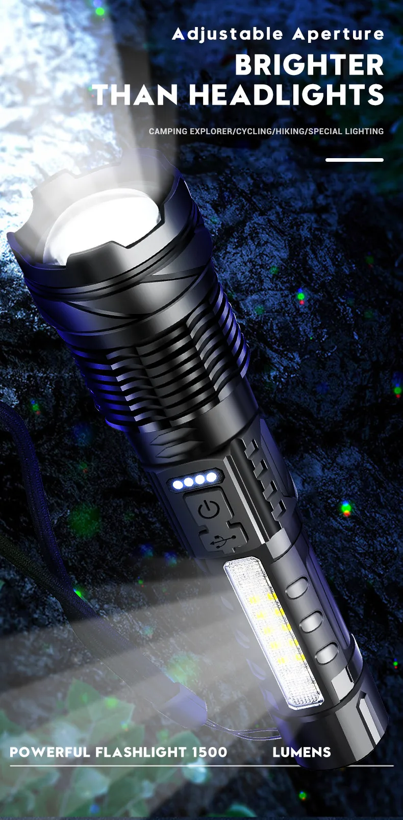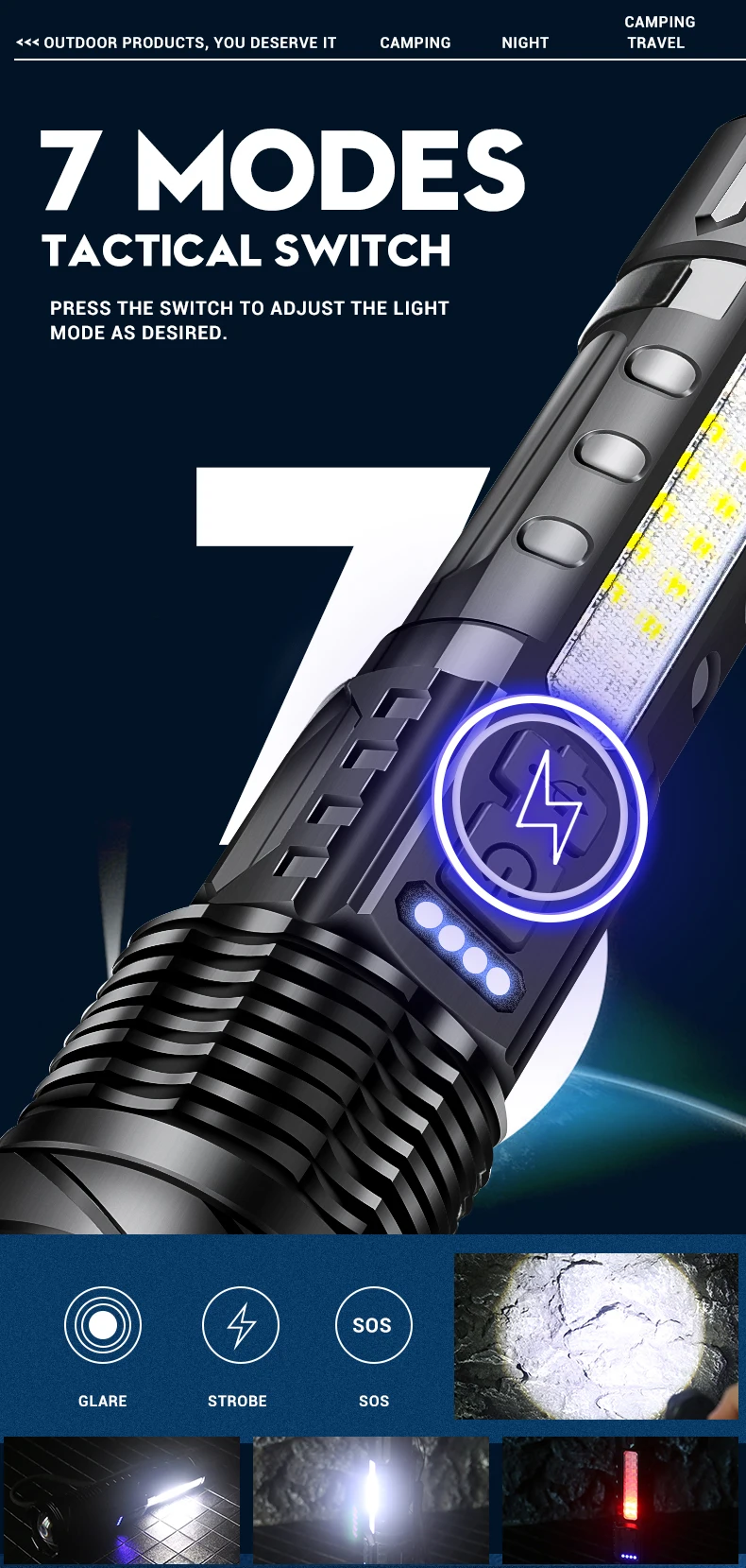 *7 lighting modes-press the button 5 times to cycle between high brightness, low brightness, SOS, side light white light high brightness, side light white light low brightness, side light red light \ side light red light + blue light flashing, lighting modes