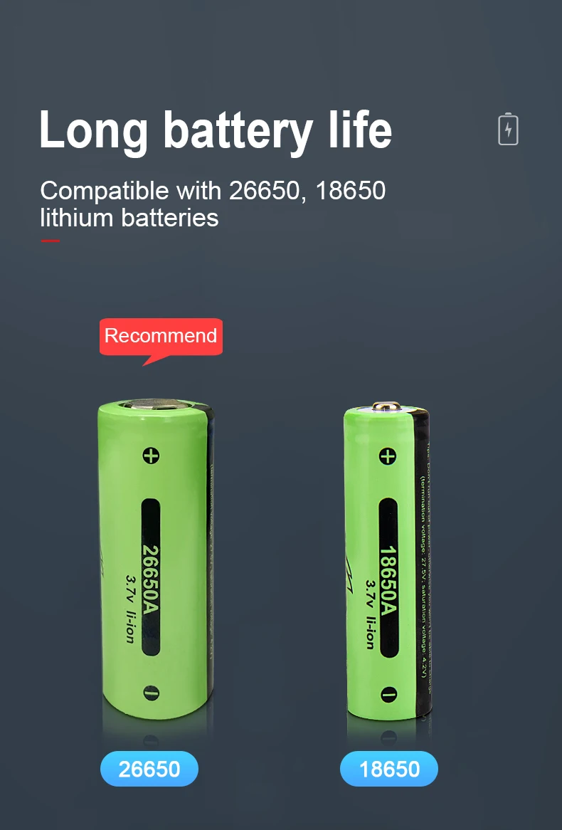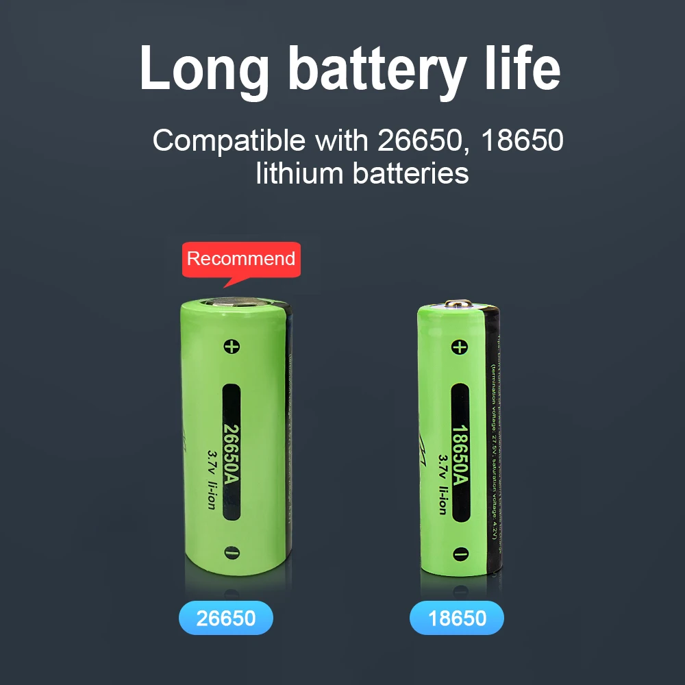 ๐Use 1*18650 or 1*26650 rechargeable battery, 26650 battery will work longer