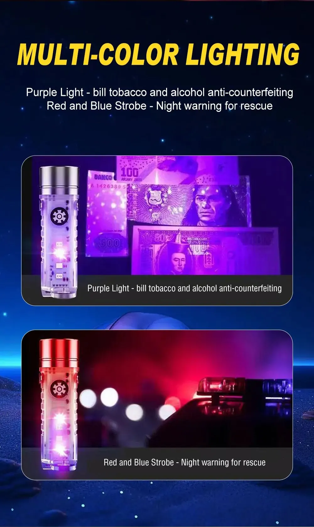 MULTI-COLOR LIGHTING:Flashlights are also available in a variety of light colors for your needs.Purple light can inspect banknotes, bills, etc. Red and blue light flash can warn rescue at night, lighting penetration is strong.