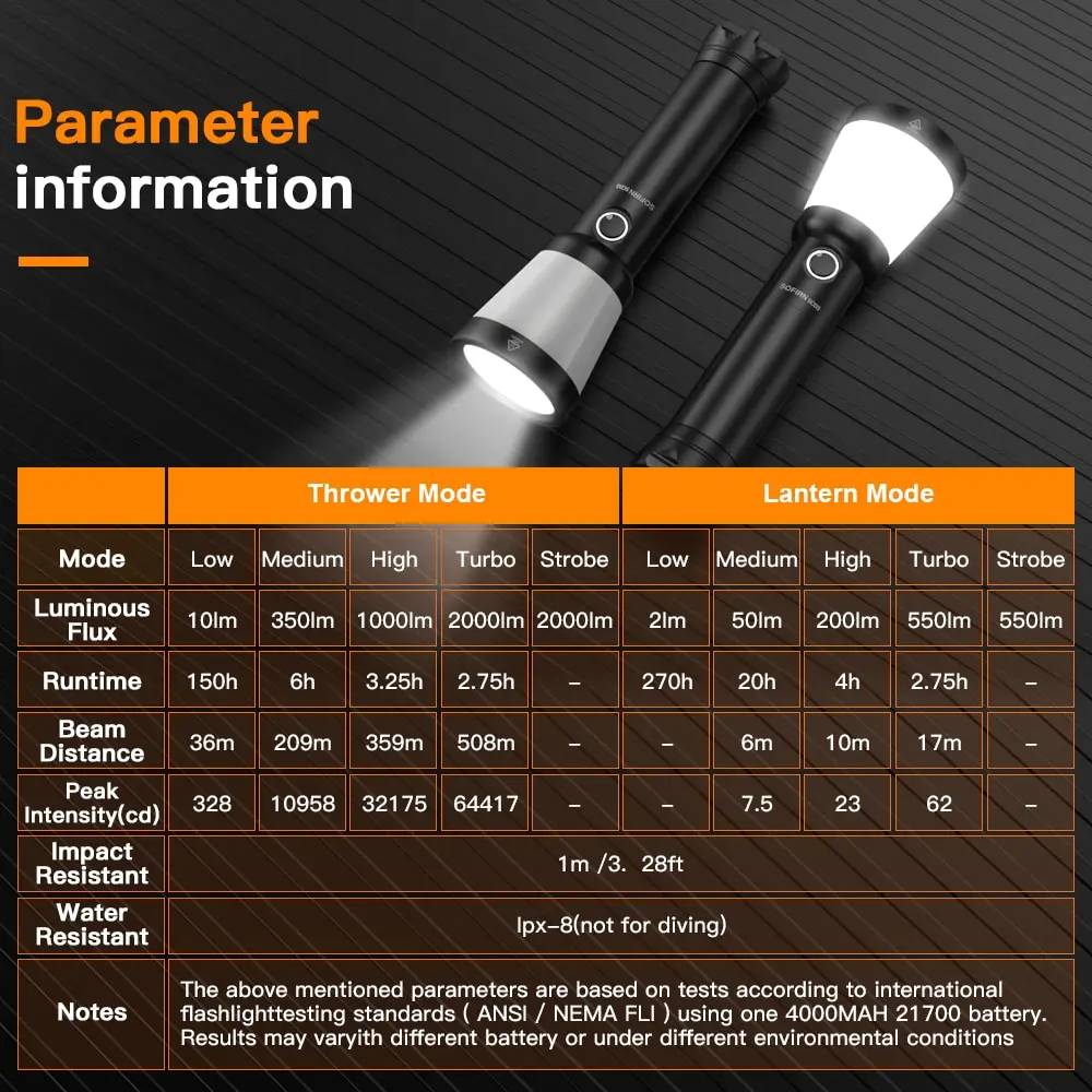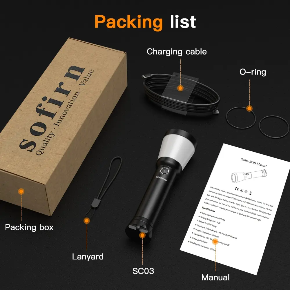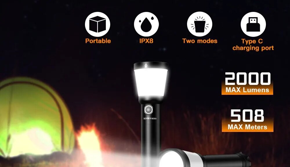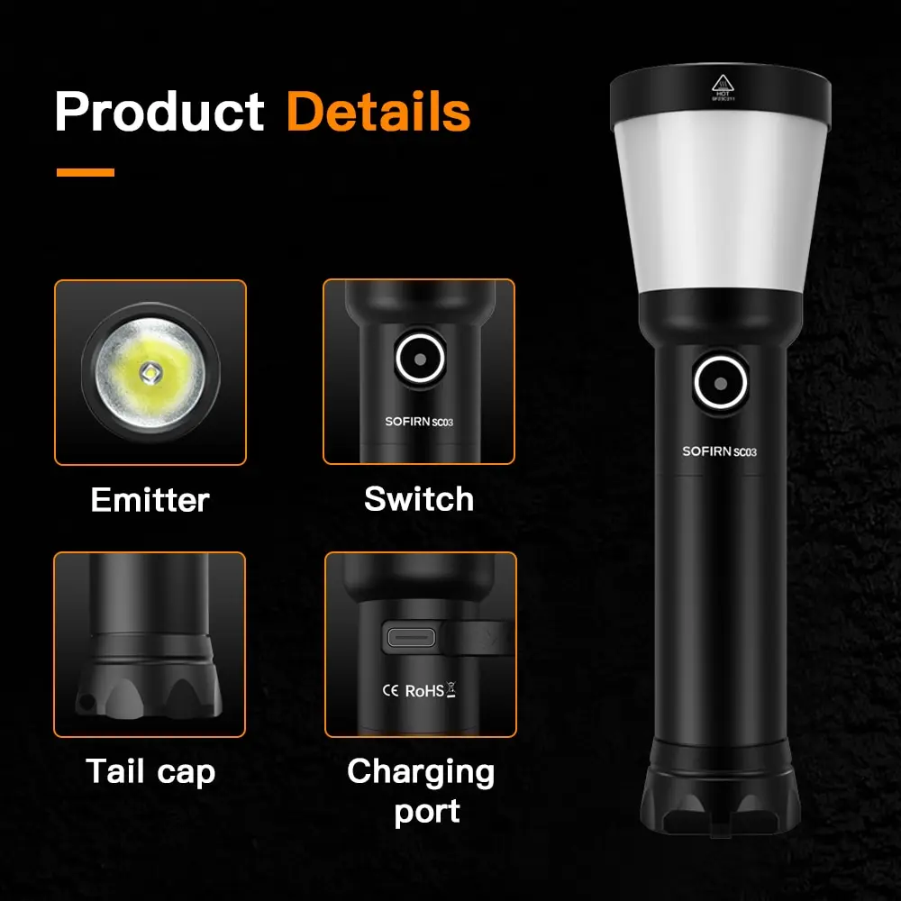 Sofirn SC03 Camping Light 2in1 2000LM Powerful Flashlight USB C Rechargeable 21700 Lantern Outdoor Torch with Combo Side Light