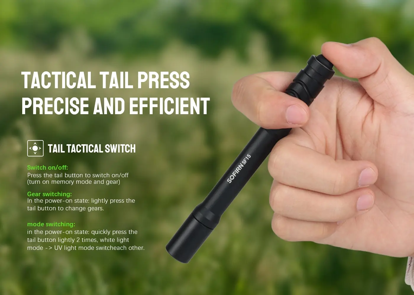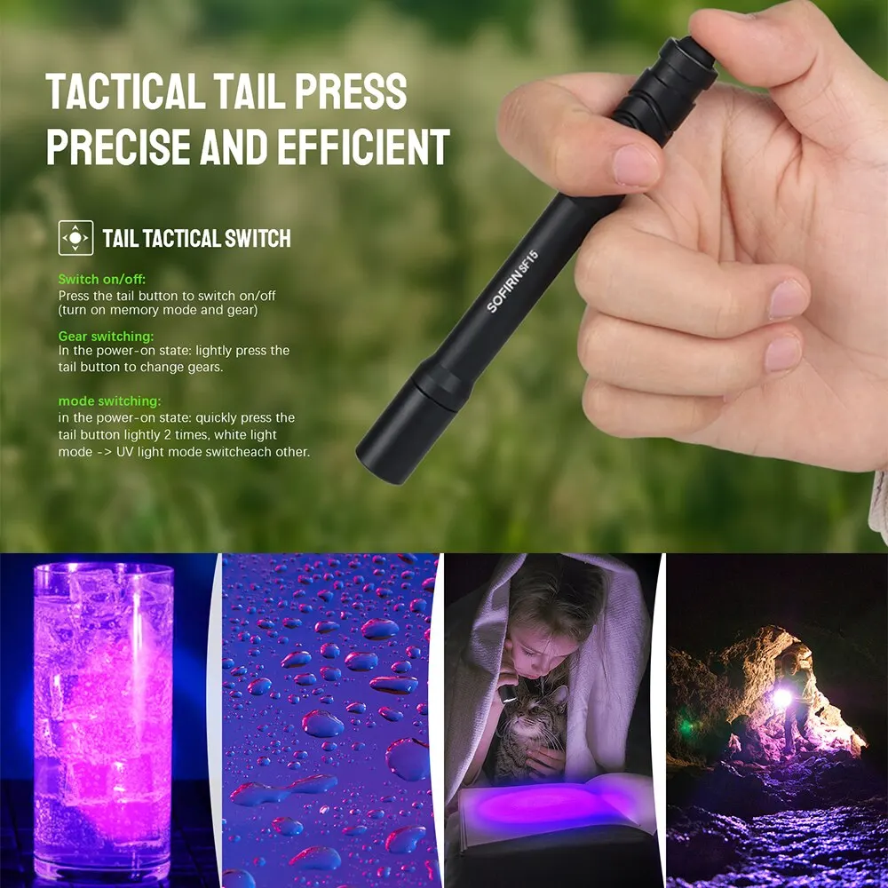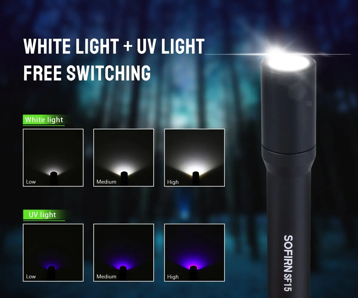 • Dual purple light:The Sofirn sf15 UV flashlight emits both purple and white light, making it perfect for detection and identification of substances.