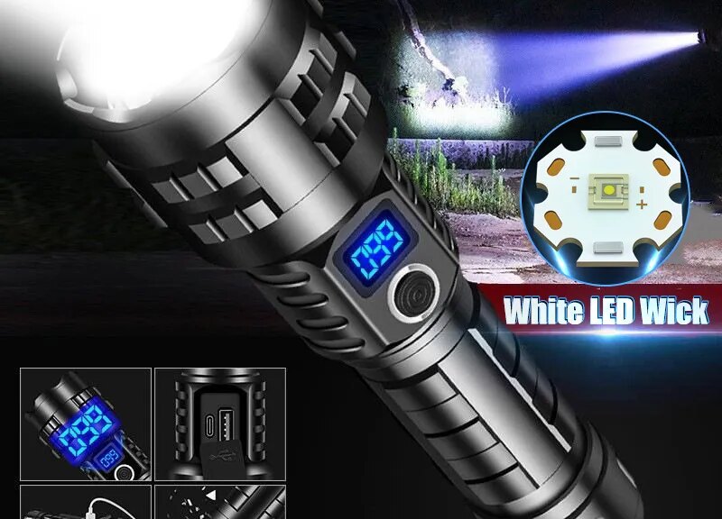 The latest long-range LED flashlight uses a 50W LED wick as the light-emitting point, and the maximum lumens is100000, lumens. It is the flashlight with the longest illumination distance on the market. There are 5 modes, suitable for various places. The flashlight uses 18650 or 26650 batteries and can be used for 6-15 hours on a single charge. With 4-level power display, you can know the remaining power at any time, and use the C-type fast charging charger to charge, and the charging speed is twice that of ordinary chargers. It is a must-have for outdoor activities and a small helper for the family.
