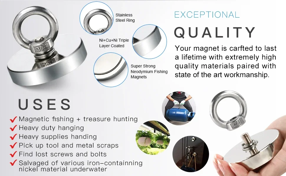 About this product SUPER POWERFUL – This magnets is 16/20/25/32/36/42/48/60/75/90 mm in diameter, adopt strong neodymium magnet for its base. It can offer 10/19/41/70/90/134/165/265/551/772LBS pulling strength under ideal condition. About this item SUPER POWERFUL – This fishing magnets adopt strong neodymium magnet for its base. HIGH QUALITY – The powerful magnetic force is only concentrated at the bottom, The other three sides are Protected by steel cups that almost no magnetic force and magnetic force equivalent to 10 times the volume of the same magnet. force permanent, long service life. Made under ISO 9001 Quality Systems. BEST COATING – Ni+Cu+Ni Triple Layer Coated. The Best Coating Available, which Provides a Shiny and Rust Resistant Coated steel cup provides protection for the magnet and helps to prevent chipping or cracking. MULTI USE – Unique design with Countersunk Hole and Eyebolt Great for salvaged of various iron-containning nickel material underwater and Good idea for magnet fishing, lifting, hanging, retrieving applications. Have fun to searching items like eyebolt, screws, hooks, fasteners and so on in your warehouse garage or yard. PERMANENT STRENGTH – Neodymium is a kind of rare earth metal, it’s suitable for making permanent & powerful magnets. This fishing magnet has permanent magnetism, it will be the same powerful even decades after. specification: 1. Shape: round 2. Material: NdFeB magnet + A3 steel + 304 stainless steel 3. Color: silver 4. Maximum vertical tension J16mm: 4KG/10LBS J20mm: 9KG/19LBS J25mm: 19KG/41LBS J32mm: 32KG/70LBS J36mm: 41KG/90LBS J42mm: 61KG/134LBS J48mm: 75KG/165LBS J60mm: 120KG/265LBS J75mm: 250KG/551LBS J90mm: 350KG/772LBS