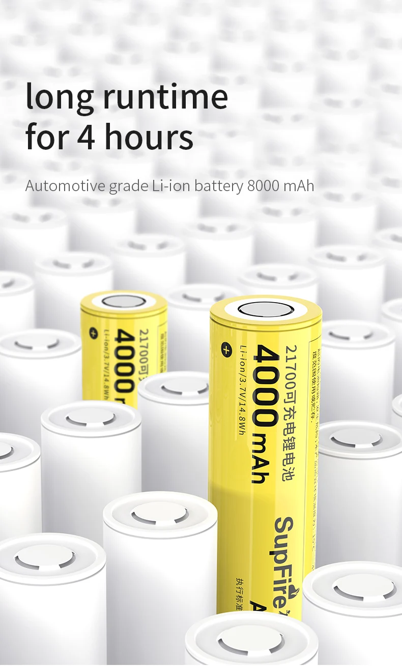 Choose a large capacity 21700 rechargeable Li-on battery, for longer runtime.