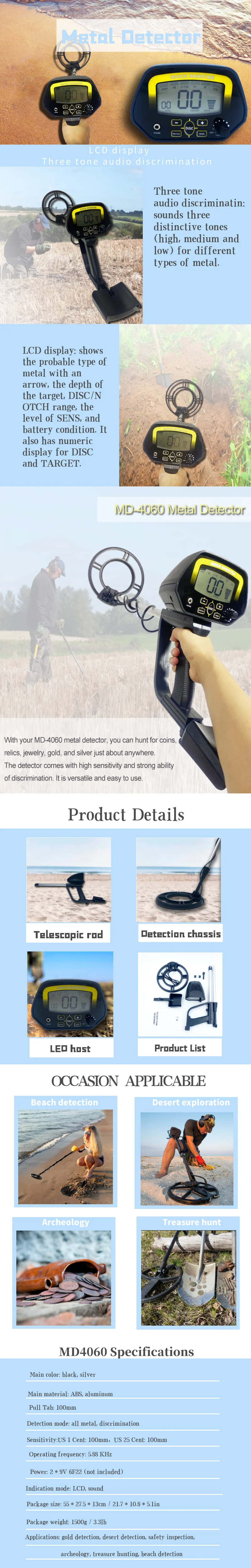 Applications: gold detection, desert detection, safety inspection, archeology, treasure hunting, beach detection