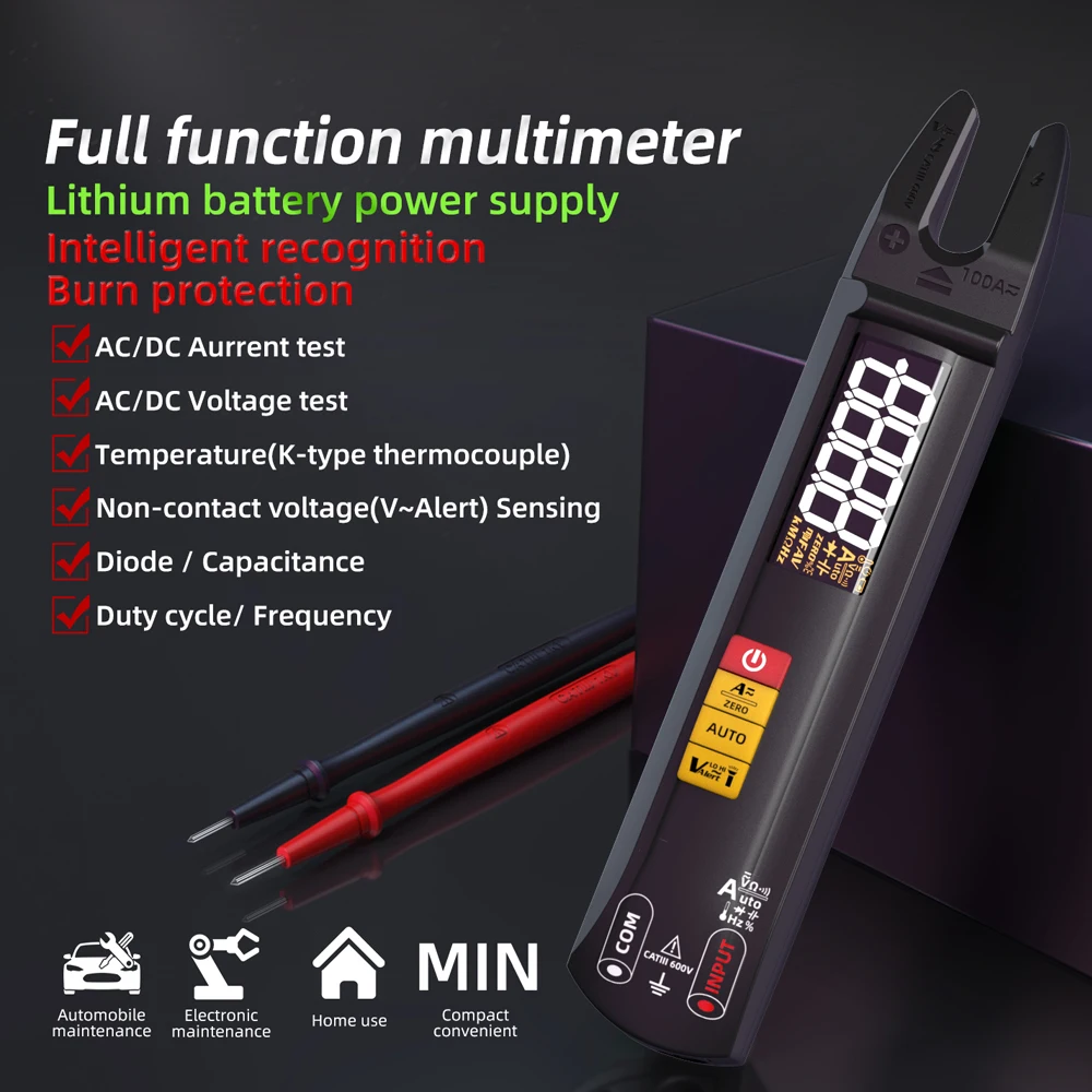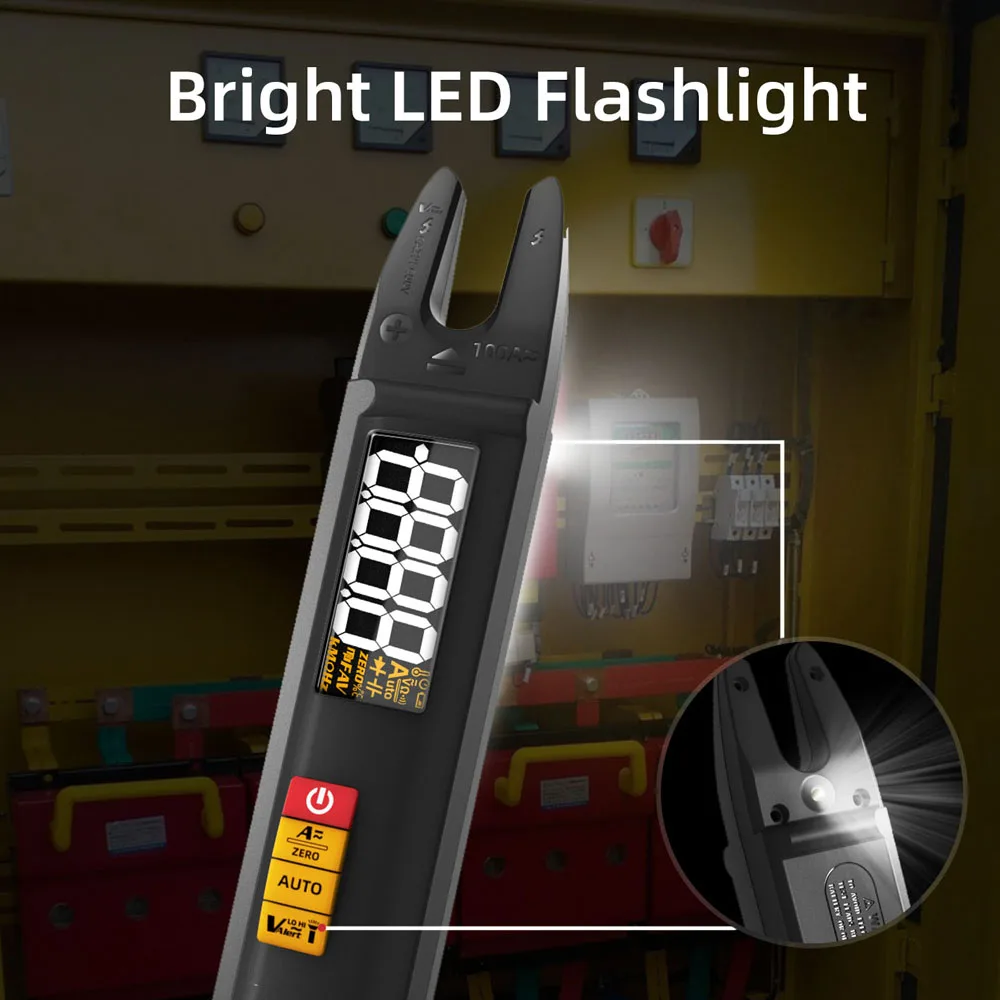 【Three-in-one Design】: The 3in1 design of an electrical test pen, a multimeter, and a clamp ammeter, provides an integrated functional experience. Adopts an intelligent chip for accurate measuring, fast responding, and high accuracy, which can provide accurate measuring results. Built-in current sensor, support for 0.5-100A automatic identification of AC and DCcurrents can also be manually switched to support DCcurrent manual zeroing mode.