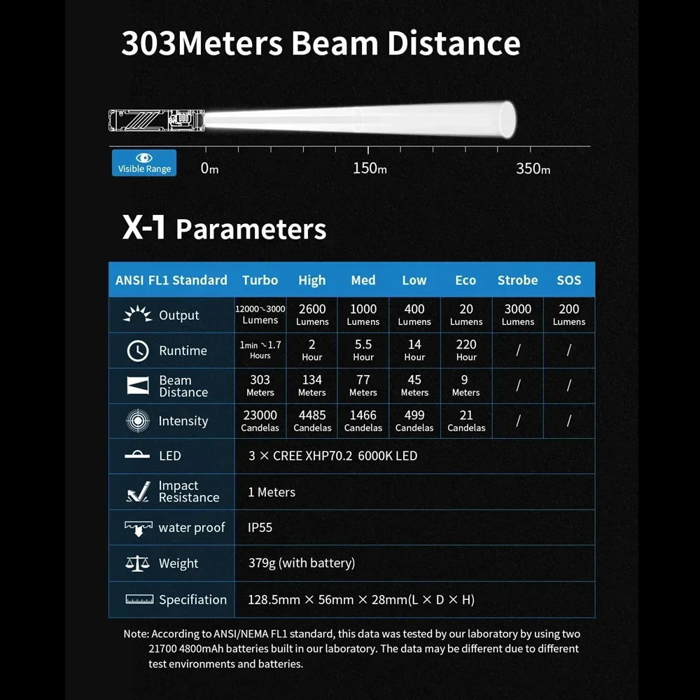 【Small And Powerful: 】Highest brightness level wuben has ever produced, reaching a max output of 12,000 lumens and a 303m beam distance with the size of 5.06*2.20*1.10 inches.